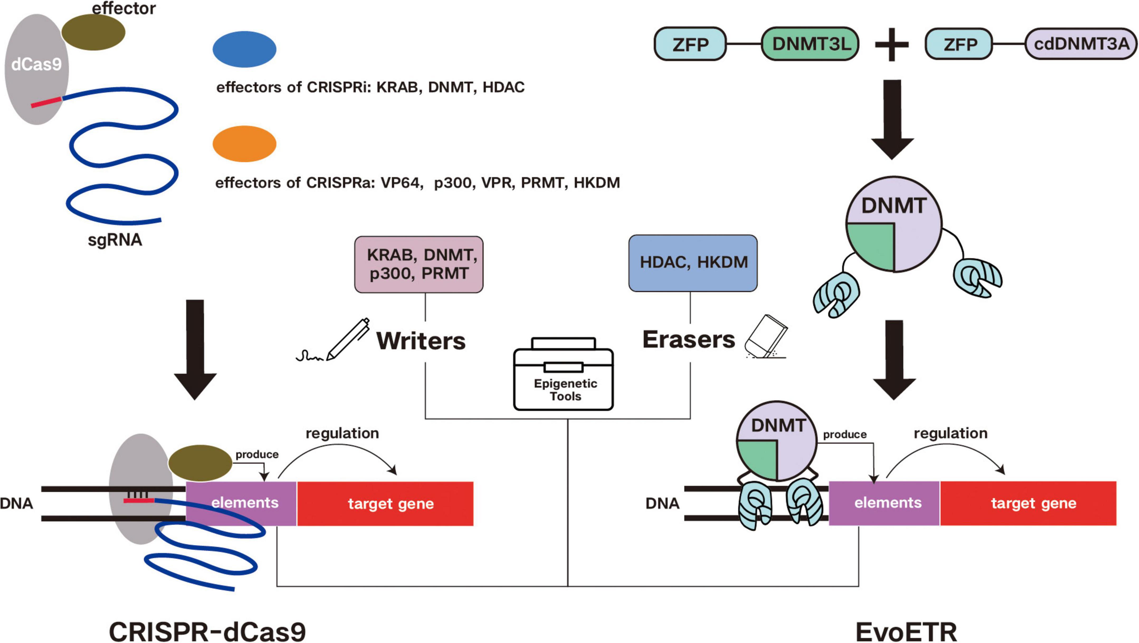 Figure 2. Mechanisms of commonly used epigenetic editor. Frequently used epigenetic editors include CRISPRa and CRISPRi, which utilize the CRISPR-dCas9 system coupled with diverse modification elements, and EvoETR (Evolutionarily Engineered Transcriptional Repressors). These editors can be categorized as “Writers” or “Erasers” based on their function of adding or removing modifications to target genes, respectively. Writer elements (e.g., KRAB, DNMT, p300, and PRMT) introduce covalent modifications to target genes, whereas eraser elements (e.g., HDAC and HKDM) remove such modifications. While CRISPR-dCas9-based epigenetic editors rely on the CRISPR-dCas9 system for target recognition, EvoETR employs zinc finger proteins (ZFPs) for targeting and utilizes the DNMT3A catalytic domain to execute epigenetic modifications on target genes.