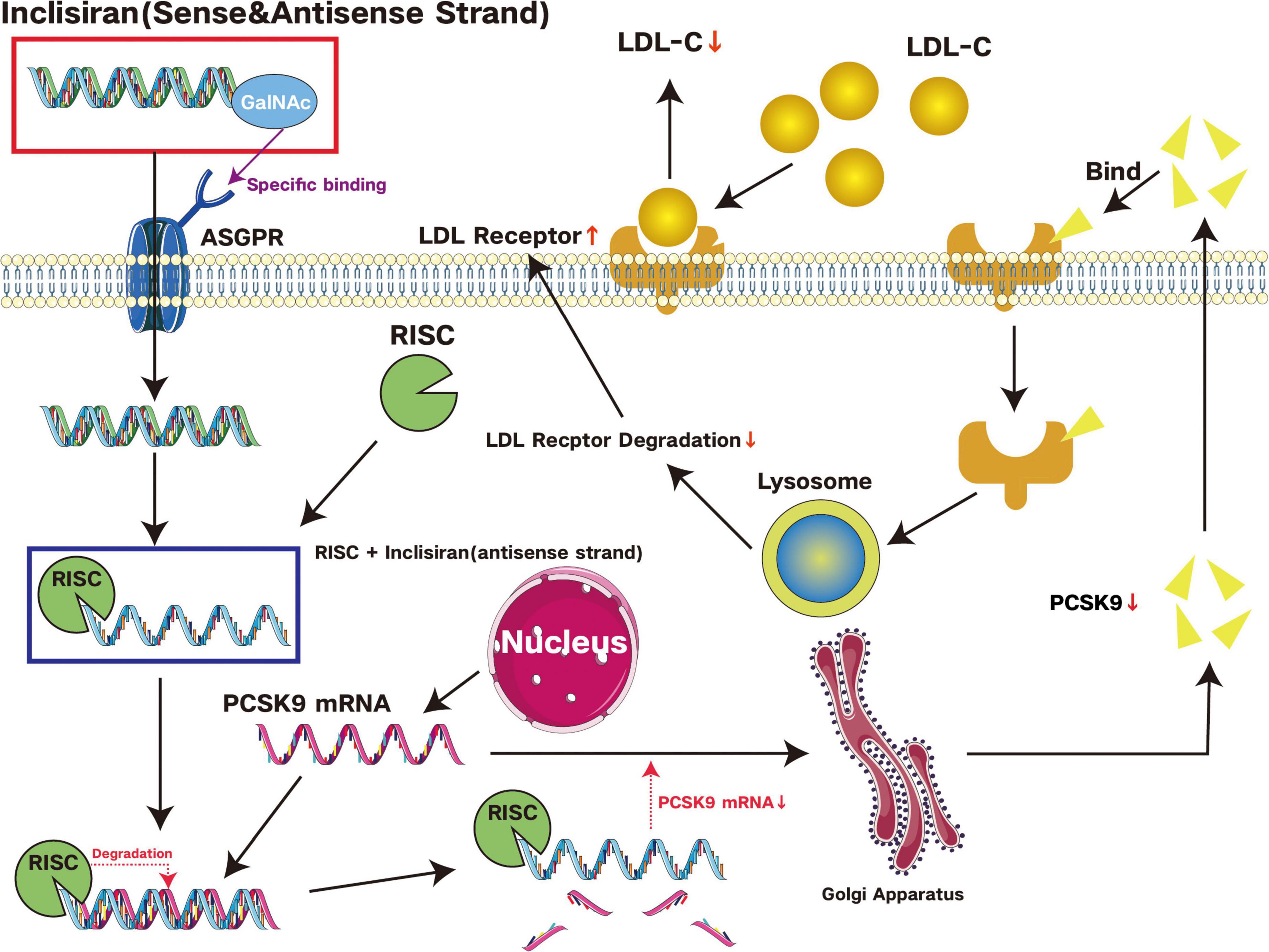 Hyperlipidemia is a condition in which abnormalities in the metabolism or function of lipids cause human blood lipid levels to exceed the normal range, as evidenced by high blood cholesterol and/or triglycerides or low HDL. PCSK9 is the ninth member of the kexin-like pre-translational enzyme family of Bacillus subtilis proteases, which are proteins that bind to the LDL receptor and induce the degradation of LDL. The LDL receptor functions in the body to remove LDL from the blood and transport it to the liver for metabolism. When the activity of PCSK9 is increased, it leads to a decrease in the number of LDL receptors, which reduces the efficiency of LDL removal and causes blood cholesterol levels to rise. Since the discovery of the extreme mechanism of action of PCSK9 at the beginning of this century, the development of PCSK9 inhibitors has become a hot topic (80). Current PCSK9 inhibitors include alirocumab and evolocumab (81). Evolocumab is a PCSK9 monoclonal antibody developed by Amgen. It is a fully human monoclonal IgG2 that reduces circulating low-density lipoprotein cholesterol (LDL-C) levels by binding to PCSK9 and preventing it from binding to the low-density lipoprotein receptor (LDLR), thereby reducing LDLR degradation. Alirocumab, a PCSK9 inhibitor co-developed by Sanofi and Regenerative Elements, is a fully human monoclonal IgG1. By inhibiting circulating PCSK9, alirocumab prevents PCSK9-mediated degradation of LDLRs, thereby increasing the number of LDLRs on the cell surface and lowering serum LDL-C levels. Alirocumab and evolocumab are both now FDA-approved and can be taken alone or in combination with a lipid-lowering agent. In addition to the two approved monoclonal antibodies, Novartis has also approved a small interfering RNA (siRNA) drug. Inclisiran is a double-stranded siRNA that degrades PCSK9 mRNA in the liver and blocks PCSK9 protein synthesis. This increases recirculation and expression of the LDL-C receptor on the surface of hepatocytes, increasing hepatic uptake and lowering circulating LDL-C. Inclisiran’s mechanism of action also involves its prolonged presence in hepatocytes after clearance from plasma, allowing for a prolonged duration of LDL-C lowering effects. The efficacy of a single injection can be maintained for half a year, making it an ultra-long-acting PCSK9 inhibitor. It is indicated for the treatment of primary hypercholesterolemia (heterozygous familial and non-familial) or mixed dyslipidaemia in adults and in patients who do not achieve LDL-C treatment goals despite treatment with the maximum tolerated dose of statins and in patients for whom statins are intolerable or contraindicated (82). The Figure 3 gives a brief schematic diagram of the mechanism of Inclisiran.