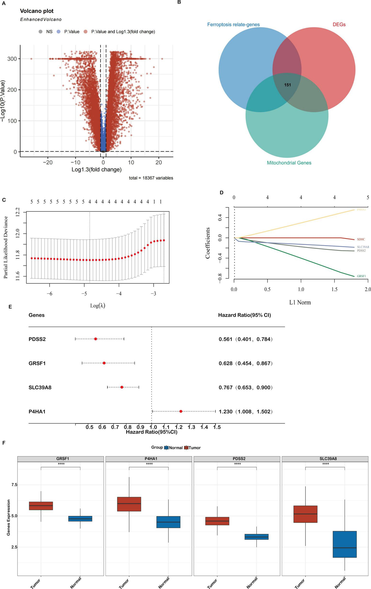 To construct a prognostic risk model based on mitochondrial ferroptosis-related differentially expressed genes (DEGs), we initially performed univariate Cox regression analysis on 151 candidate genes, identifying those significantly associated with overall survival in colon adenocarcinoma (COAD) patients. These candidate prognostic genes were subsequently subjected to feature selection using the Least Absolute Shrinkage and Selection Operator (LASSO) regression algorithm. A 10-fold cross-validation procedure was employed to avoid overfitting and determine the optimal regularization parameter. The value of λ corresponding to the minimum partial likelihood deviance was selected as the optimal penalty parameter for model construction. Ultimately, four hub genes—PDSS2, GRSF1, SLC39A8, and P4HA1—were identified as key components of the prognostic model (Figures 2C,D). The hazard ratios (HRs) for these genes are shown in Figure 2E. Finally, a prognostic risk score was established based on their expression levels and coefficients as follows: Riskscore = (-0.2466)*PDSS2 + (-0.6606)*GRSF1 + (-0.1669)*SLC39A8 + (0.4738)*P4HA1.