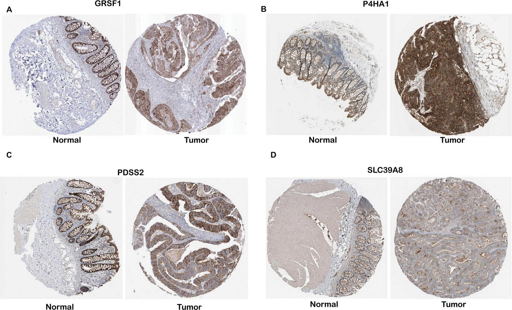 Protein-level validation of four gene expressions in COAD tissues. IHC data for GRSF1, P4HA1, PDSS2, and SLC39A8 were obtained from the Human Protein Atlas (HPA), and expression levels were interpreted based on the qualitative annotations provided by the HPA database. (A–D) Representative IHC images for GESF1, P4HA1, PDSS2, and SLC39A8, respectively.