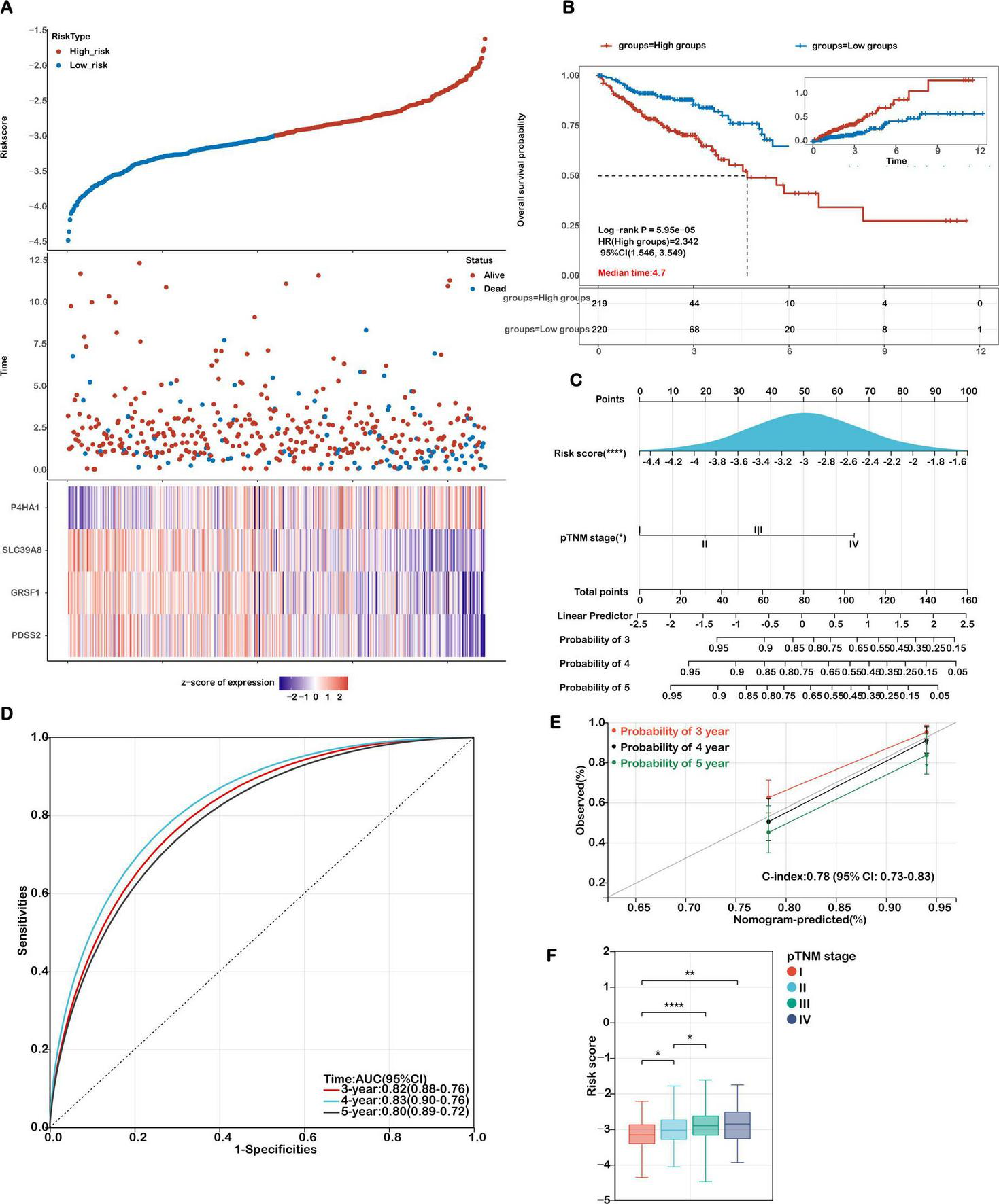 Based on these findings, we constructed a prognostic nomogram that combined the risk score and pTNM stage to estimate 3-, 4-, and 5-year survival probabilities (Figure 4C). Receiver Operating Characteristic (ROC) analysis demonstrated that the nomogram exhibited high predictive performance, with AUC values of 0.82, 0.83, and 0.80 for 3-, 4-, and 5-year survival, respectively (Figure 4D). Calibration plots further verified the agreement between predicted and observed outcomes, supporting the model’s predictive precision. The concordance index (C-index) of the nomogram reached 0.78 (95% CI: 0.73–0.83; p < 0.001), indicating strong discriminatory power and clinical applicability (Figure 4E). Comparative analyses were performed to evaluate the model’s predictive performance against established pathological prognostic factors including TNM staging, age and gender (Supplementary Figure S4). The ferroptosis-related gene signature significantly outperformed conventional prognostic markers (TNM staging, age, gender) in predictive accuracy (AUC: 0.82 vs. 0.65/0.61/0.56, respectively; all p < 0.01) and demonstrated superior 5-year overall survival stratification (Supplementary Figure S4).