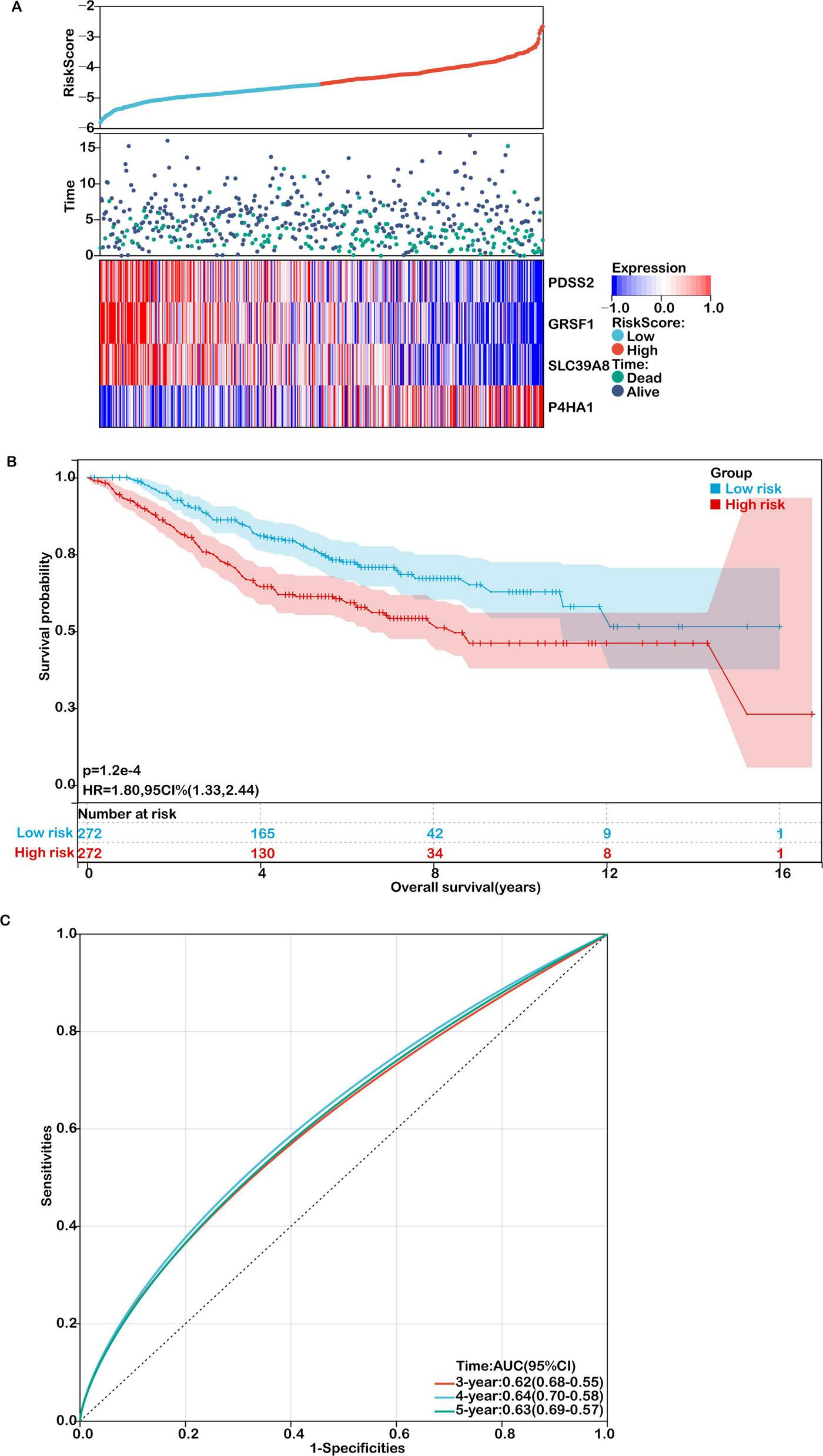 Patients from the TCGA-COAD cohort were stratified into high- and low-risk groups using the median risk score. A clear distribution of risk scores, survival outcomes, and expression levels of the four genes is shown in Figure 4A. Kaplan–Meier survival analysis demonstrated that patients in the high-risk group had significantly shorter OS than those in the low-risk group (P = 5.95e-05; Figure 4B). Receiver Operating Characteristic (ROC) curve analysis showed good predictive performance for the 3-, 4-, and 5-year OS, with area under the curve (AUC) values of 0.71, 0.75, and 0.74, respectively (Supplementary Figure S2).
