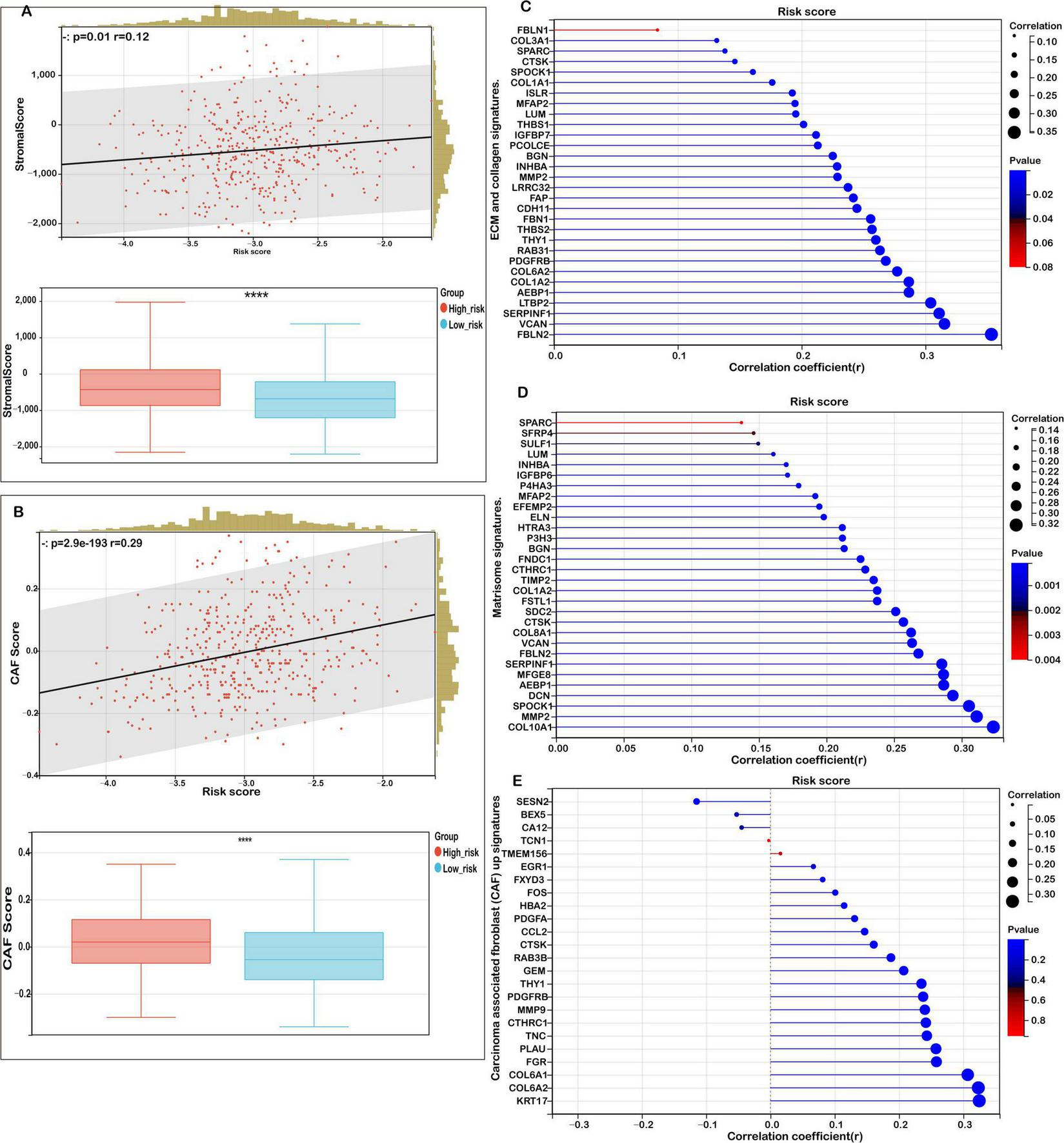 Correlation between risk score and tumor microenvironment (TME) signatures in COAD. (A) Correlation analysis between stromal score and risk score, with distribution comparisons between low- and high-risk groups. (B) Analysis of the relationship between carcinoma-associated fibroblast (CAF) score and risk score, with distribution comparisons between low- and high-risk groups. (C) Correlation of risk scores with extracellular matrix (ECM) and collagen gene signatures. (D) Correlation between risk scores and matrisome gene expression. (E) Association of the risk score with upregulated and downregulated CAF signatures. Statistical significance is marked as ****P < 0.0001.