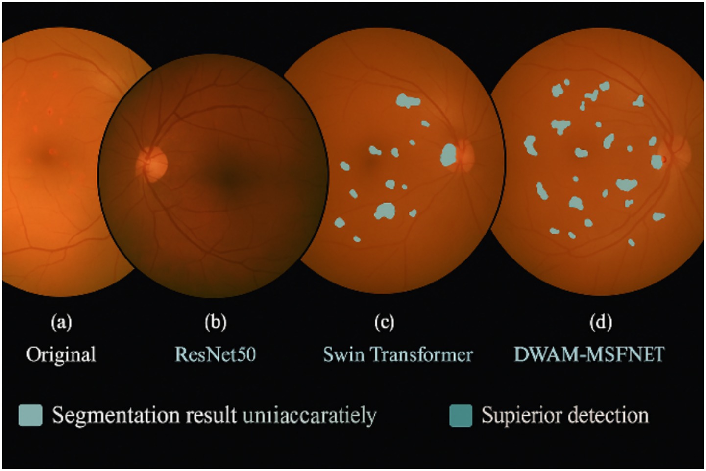 In Figure 8a, we show an original fundus image with signs of diabetic retinopathy. The ground truth lesions (microaneurysms and small hemorrhages) are subtle and located in various parts of the retina. Figure 8b displays the result from ResNet50. We observe that ResNet50 misses several small lesions – the heatmap indicates that it mostly focuses on the more obvious large hemorrhages, failing to detect faint microaneurysms. This is expected because CNNs with fixed receptive fields may overlook tiny features, especially when overshadowed by larger features. Figure 8c shows the output from Swin Transformer (Tiny). Swin does better than ResNet50 in detecting more lesions; it marks some of the smaller lesions thanks to its attention mechanism. However, it still has limitations: for instance, in the central region of the retina, some fine microaneurysms are not highlighted, and the overall segmentation of lesion areas is not very precise (some boundaries are missed). This can be attributed to Swin’s window-based attention being locally restricted – although it shifts windows, it might not capture extremely fine details within each window if the window size is not optimally chosen. Figure 4d shows the result from DWAM-MSFINET on the same image. Our model clearly highlights both the small and large lesions across the retina. Even tiny microaneurysms that were missed by the other models are detected (indicated by the small red spots in the heatmap), and the larger lesions like hemorrhages and exudates are also accurately identified. The dynamic attention in DWAM-MSFINET allows it to allocate extra focus to those tiny lesion regions, and the multi-scale feature fusion ensures that features of various sizes are recognized. Consequently, the segmentation mask produced by DWAM-MSFINET covers the pathological areas more completely and with finer granularity.