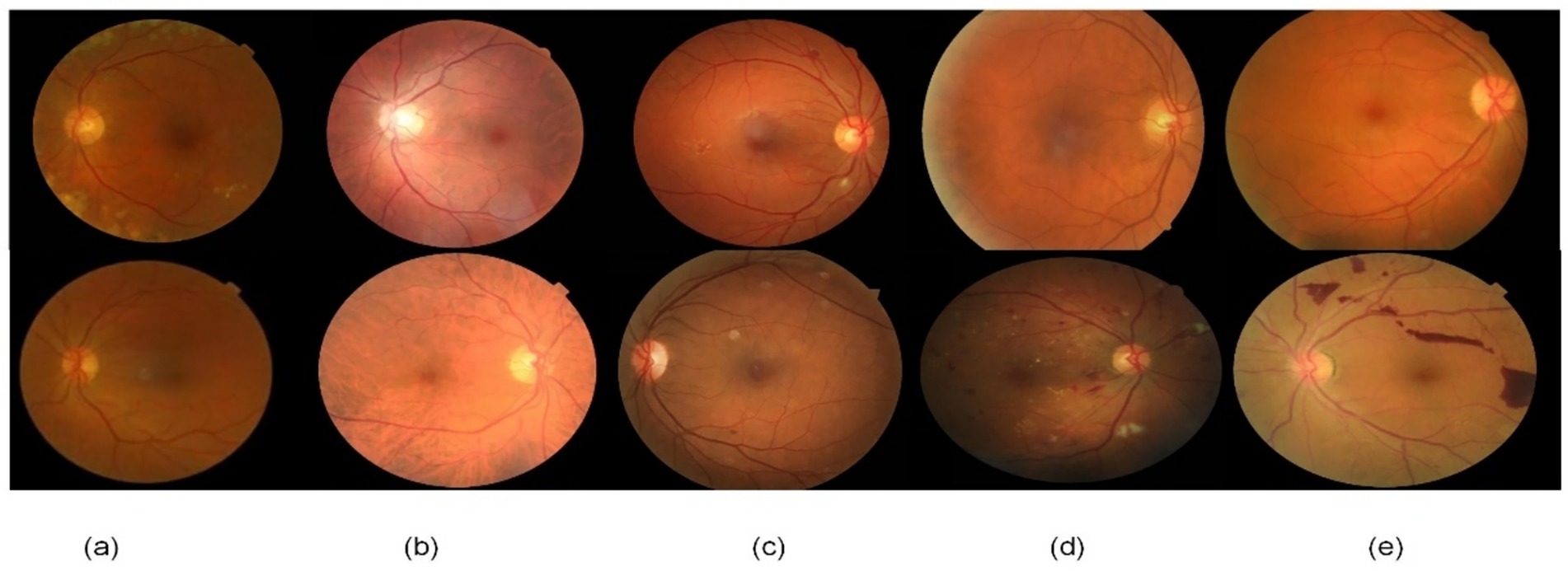 Figure 2. Representative retinal fundus images from each DR severity class in our dataset, illustrating increasing lesion burden from (a) no DR through (e) proliferative DR. Key pathological features are highlighted for each stage: (a) a normal retina with no lesions, (b) mild DR showing a microaneurysm (tiny red dot), (c) moderate DR with multiple hemorrhages and hard exudates (yellowish deposits), (d) severe DR exhibiting extensive hemorrhages and cotton wool spots (ischemic areas), and (e) proliferative DR marked by abnormal new blood vessel growth (neovascularization).