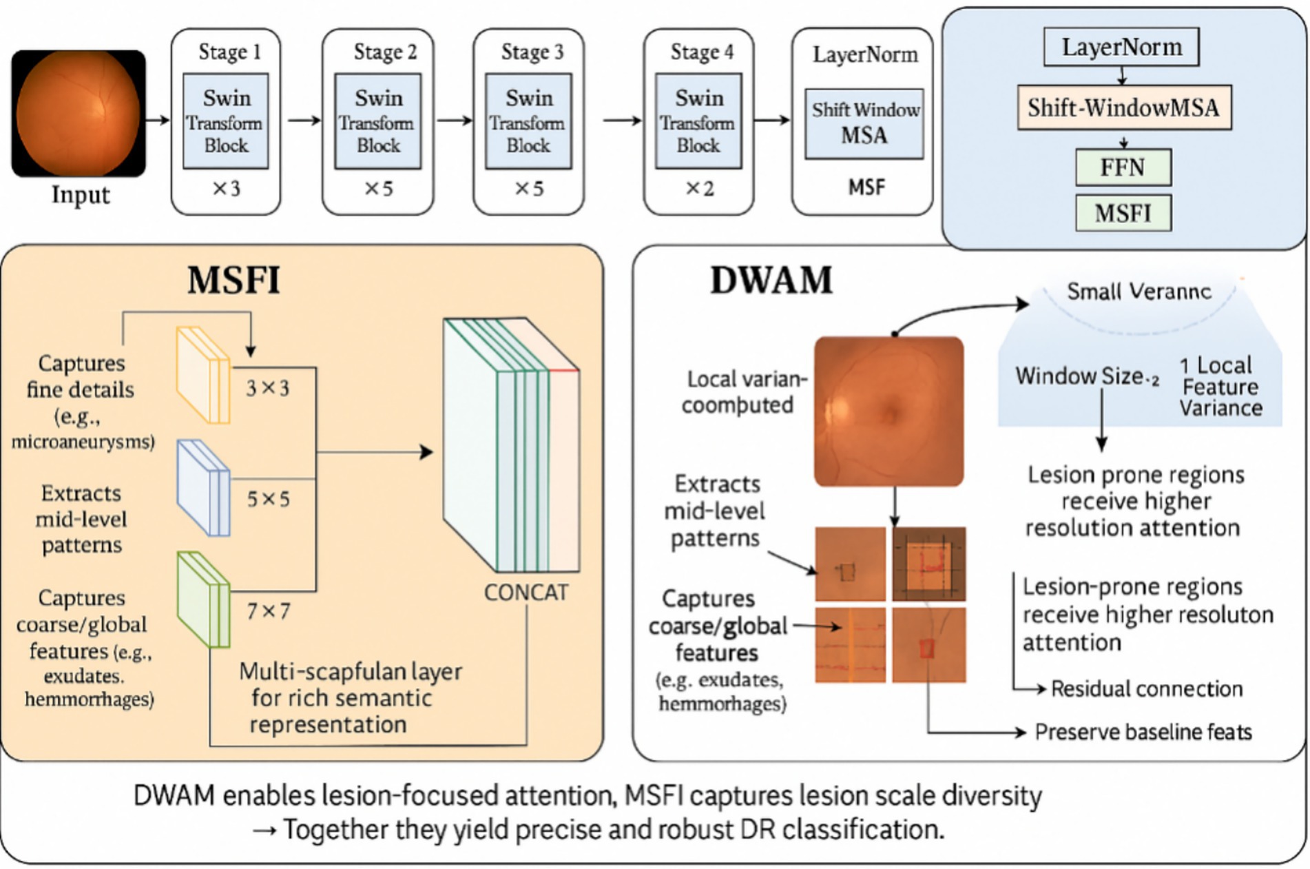 Figure 3. Overview of the DWAM-MSFINET architecture. The model processes an input fundus image through a transformer backbone to extract features, then splits into two parallel pathways: (1) the DWAM branch, which applies a self-attention mechanism with dynamically sized windows tailored to local feature variance, and (2) the MSFI branch, which applies multiple convolution filters of different sizes (e.g., 3 × 3, 5 × 5, 7 × 7) to capture lesions at multiple scales. The outputs from both branches are then fused and passed to a classifier that outputs the predicted DR severity class. This symmetrical design allows the network to capture both detailed lesion information and global context for improved DR detection.
