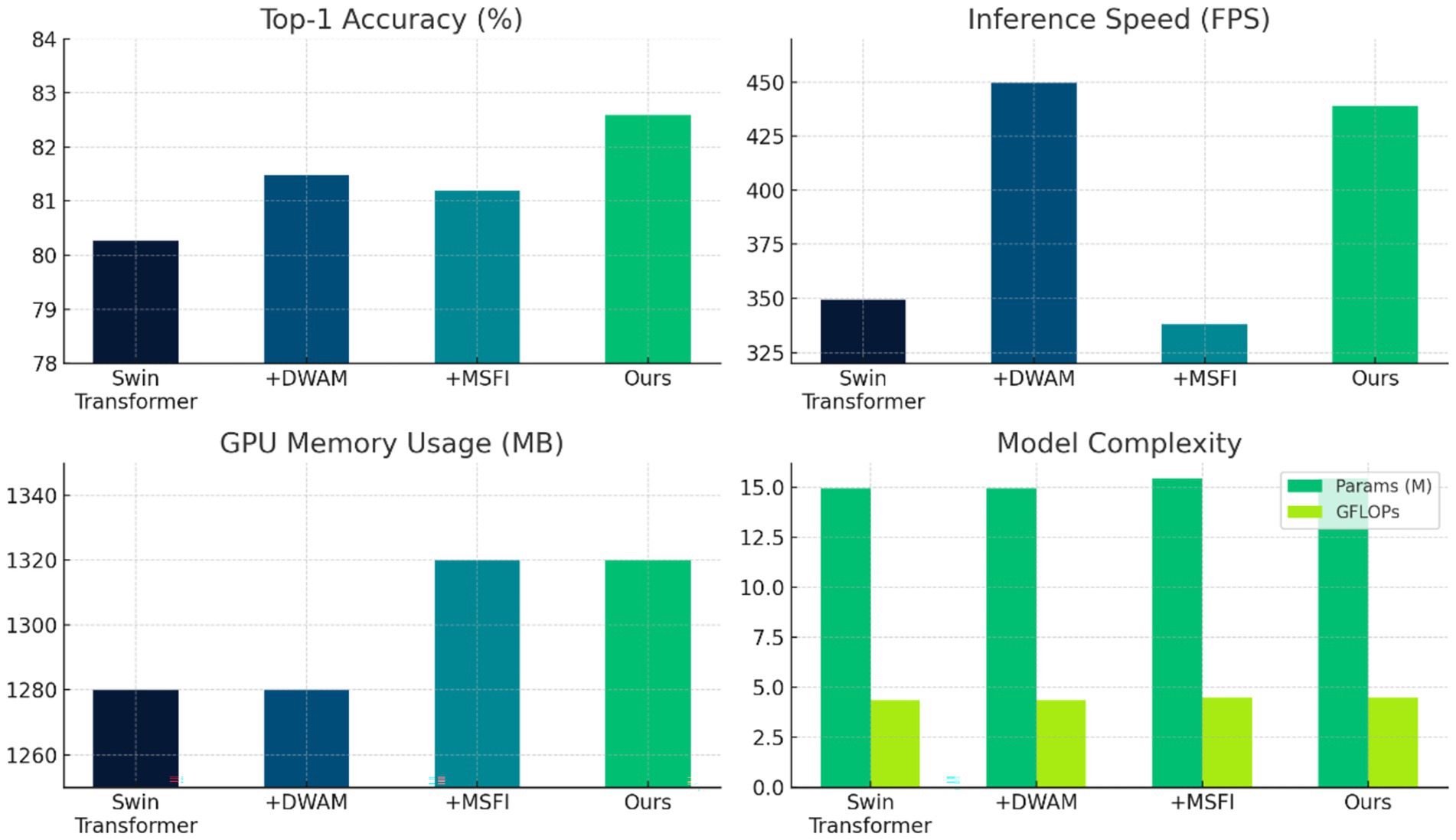 In this ablation experiment, we focus on the Dynamic Window Adaptation Mechanism (DWAM). We compare four configurations in the ablation study to evaluate the effectiveness of the DWAM module: (A) the baseline Swin Transformer model without any DWAM components; (B) the baseline model with DWAM’s feature-driven window adjustment mechanism, which dynamically scales the attention window size based on local feature variance; (C) the baseline model augmented with a lesion-region emphasis mechanism, which directs attention to pre-identified lesion-prone areas; and (D) the complete DWAM-enhanced model that integrates both dynamic window adjustment and lesion-focused attention. These configurations are directly reflected in Figure 4, which presents the Top-1 accuracy and inference speed (FPS) of each setting, showing progressive improvements from (A) through (D), with the full DWAM configuration achieving the best balance between accuracy and efficiency. For fairness, none of these variants include the MSFI module in this particular study. All models in this comparison have roughly the same number of parameters and GFLOPs, since DWAM primarily changes how attention is applied rather than adding heavy layers.