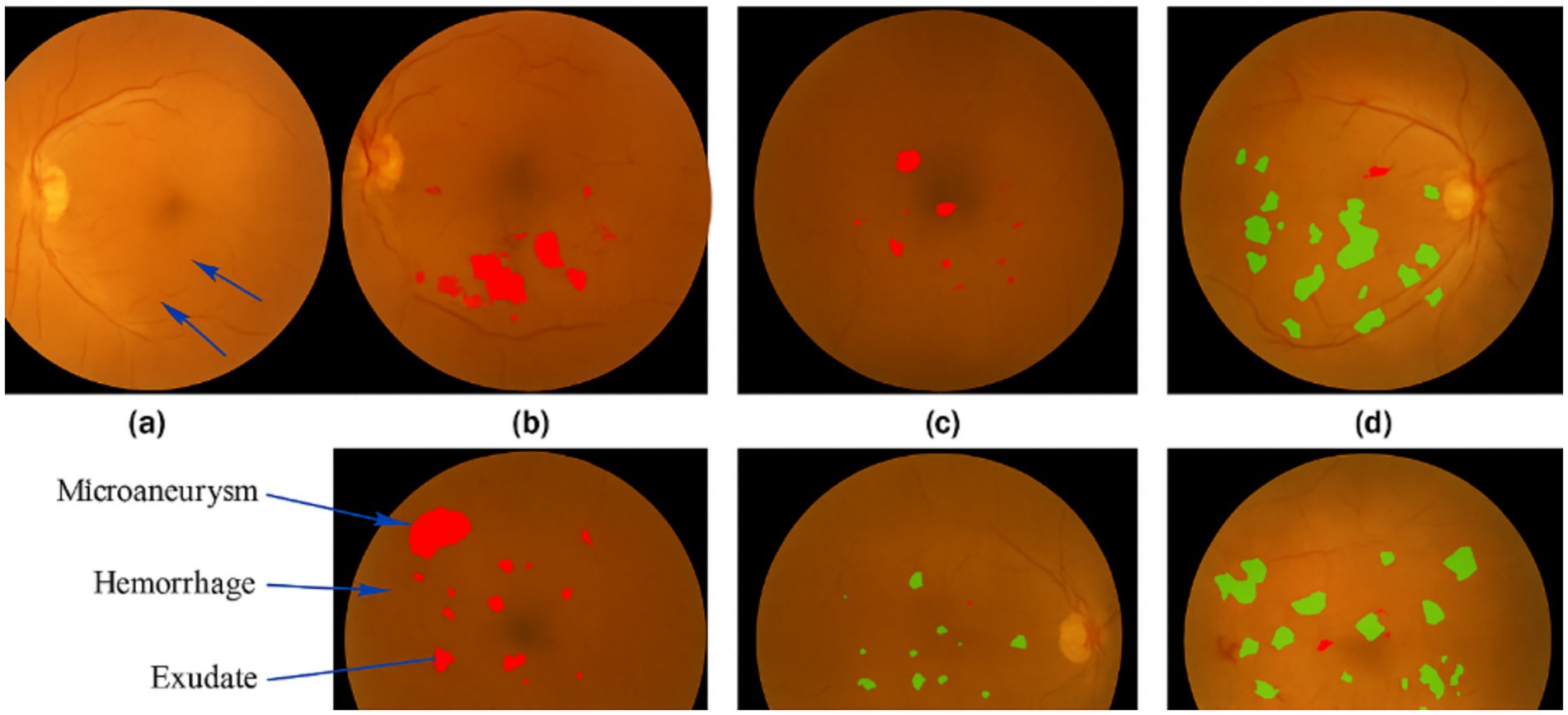 Figure 8. Visualization of various diabetic retinopathy. (a) Original retinal image with diabetic retinopathy. (b) Segmentation result from ResNet50 showing missing or inaccurate detection of small lesions. (c) Segmentation result from Swin Transformer, showing some improvement but missing finer details. (d) Segmentation result from DWAM-MSFINET, showing superior detection of lesions, especially the small and early-stage ones.