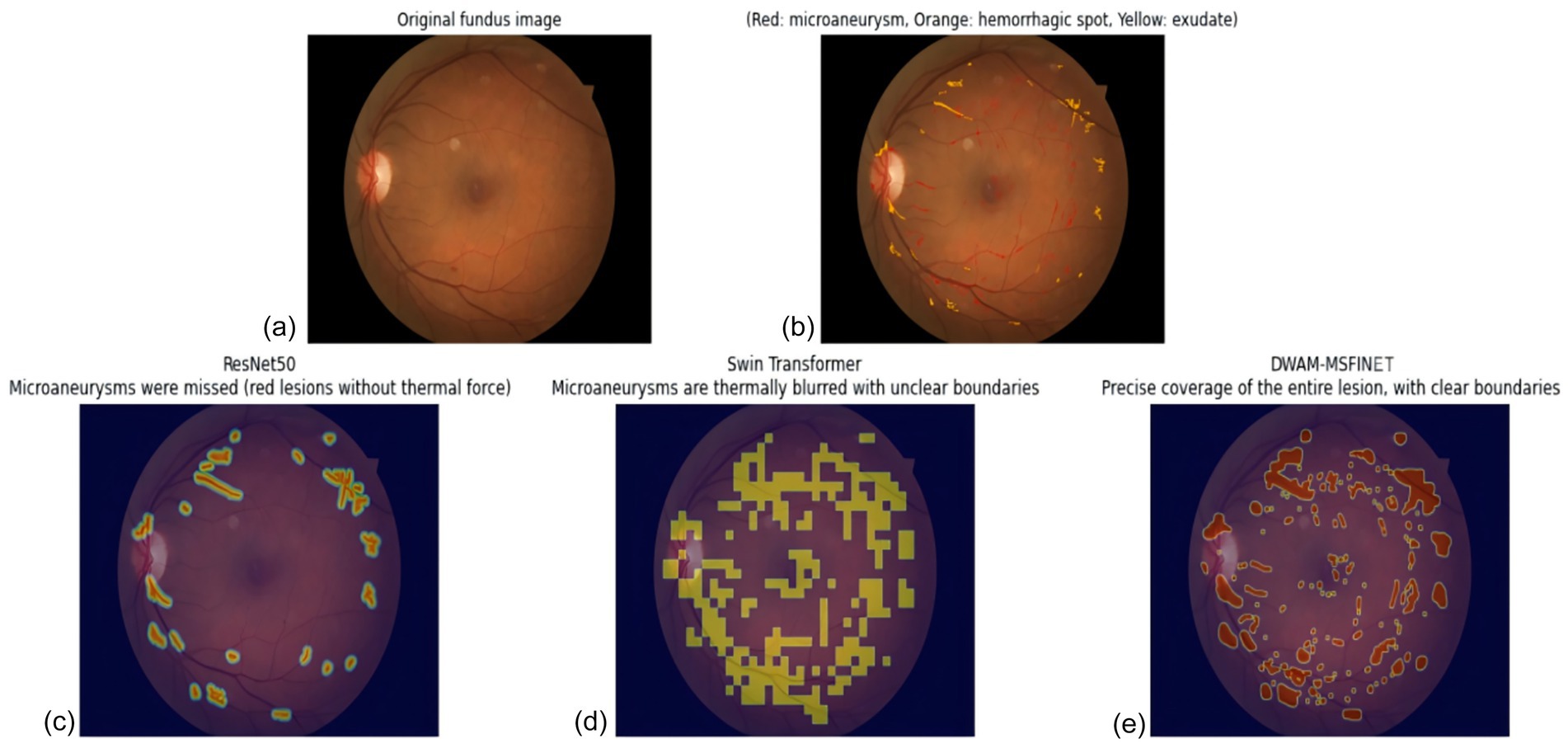 Figure 9. Visualization of various diabetic retinopathy. (a) Top-left: original fundus image without annotations, displaying the retinal structure with inherent pathological regions, including subtle microaneurysms, medium hemorrhages, and large exudates. (b) Top-right: original fundus image with ground-truth annotations (Red: microaneurysms [MA, 5–50 μm], Orange: hemorrhagic spots [HE, 50–200 μm], Yellow: exudates [EX, >100 μm]), serving as the clinical reference standard for lesion localization and scale. (c) Bottom-left: segmentation result of ResNet50, characterized by weak or absent thermal activation in red MA regions, with incomplete coverage of small lesions. (d) Bottom-middle: segmentation result of Swin Transformer, exhibiting thermally blurred boundaries (diffused halos around lesions) and partial omission of fine-grained MA. (e) Bottom-right: segmentation result of DWAM-MSFINET, demonstrating robust thermal responses, sharp boundaries, and exhaustive coverage across all lesion types.