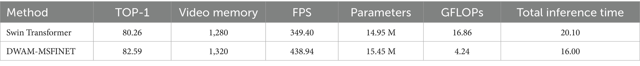 We report classification accuracy (Top-1 and Top-5), memory usage, inference speed (frames per second), model size (parameter count), computational cost (GFLOPs), and average inference time. DWAM-MSFINET outperforms the baseline in accuracy and speed with only a minor increase in model complexity. To further put our results in perspective, in Section 3.5 we provide a broader comparison with several other CNN-based and Transformer-based models (see Table 6). In summary, the initial comparisons confirm that incorporating the DWAM and MSFI modules yields tangible gains over a strong baseline, validating the effectiveness of our approach.
