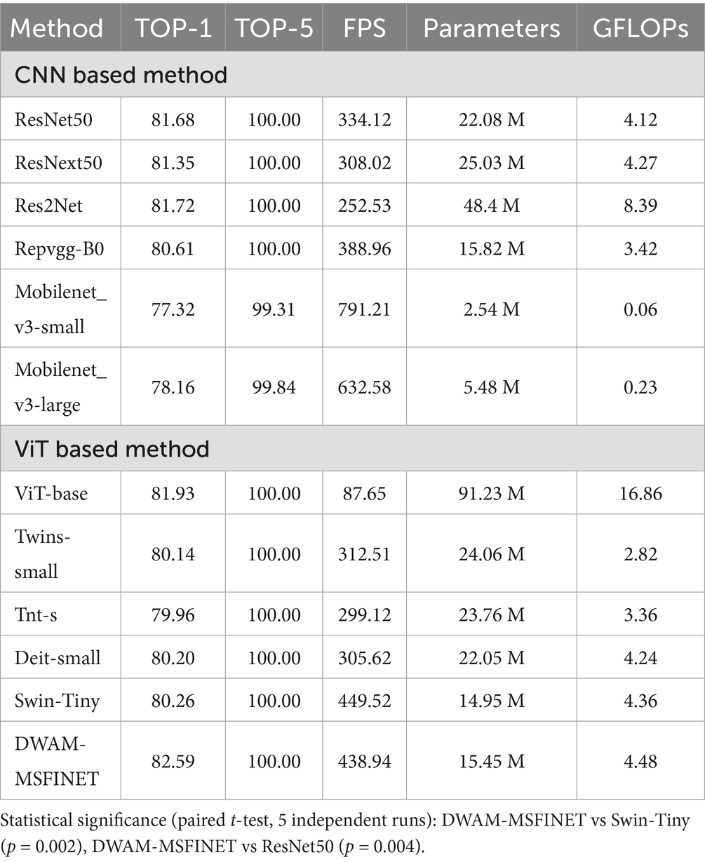 To comprehensively evaluate model performance on the proposed dataset, we compared multiple CNN and ViT-based models on the test set, reporting both Top-1 accuracy and inference speed (FPS) along with their standard deviations to assess stability (Table 7). DWAM-MSFINET consistently outperformed others on both metrics.