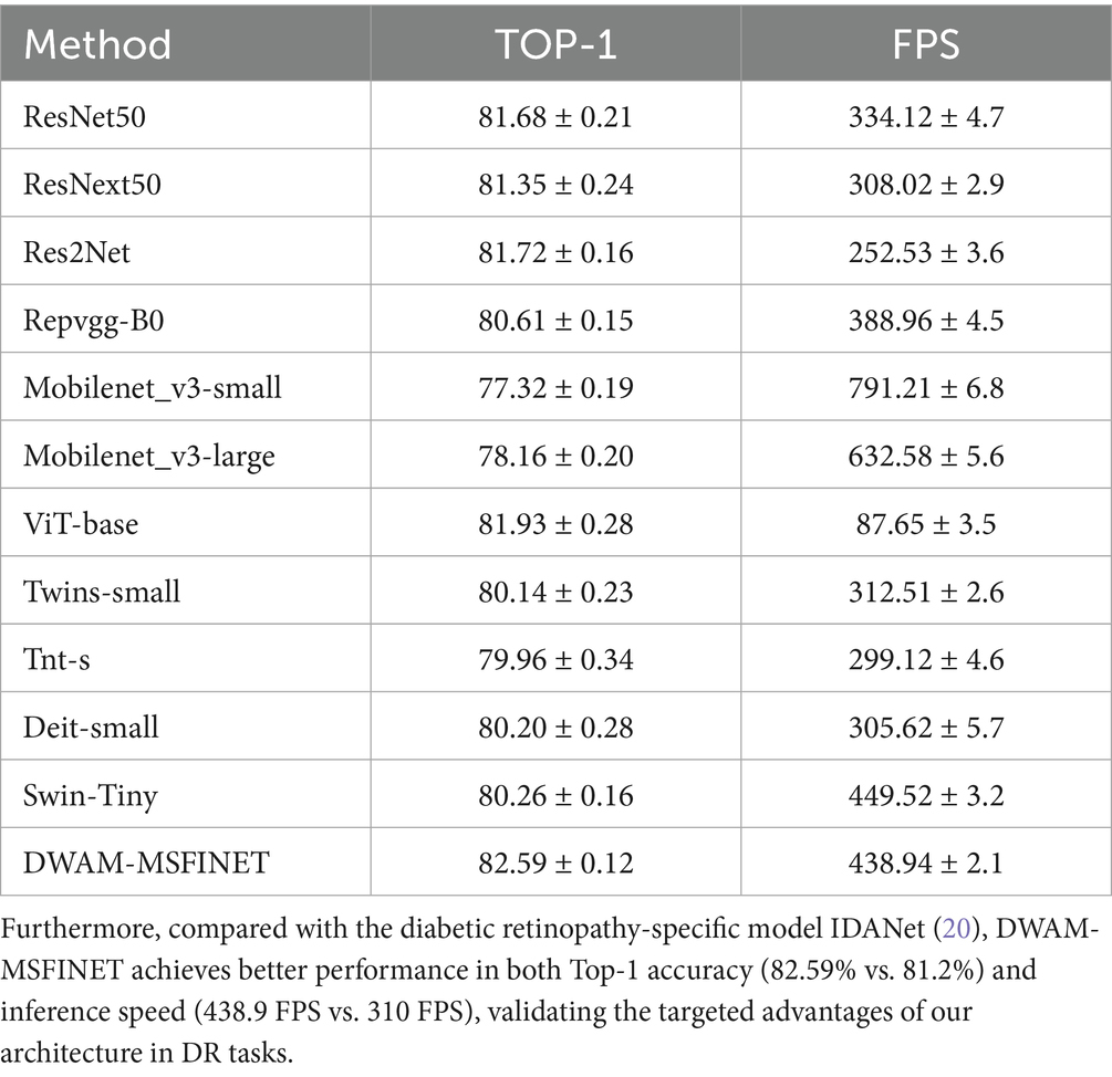 Specifically, DWAM-MSFINET achieves 78.6% Top-1 accuracy on standalone Messidor (vs. 82.59% on our dataset), demonstrating robustness to domain shift. DWAM-MSFINET achieved a Top-1 accuracy of 82.59 ± 0.12, significantly higher than ResNet50 (81.68 ± 0.21) and ViT-base (81.93 ± 0.28), with the lowest standard deviation, indicating superior accuracy and robustness. In inference speed, DWAM-MSFINET ranked second at 438.94 ± 2.1 FPS, trailing only Mobilenet_v3-small, but with substantially higher accuracy (77.32 ± 0.19), demonstrating a better trade-off between accuracy and efficiency.