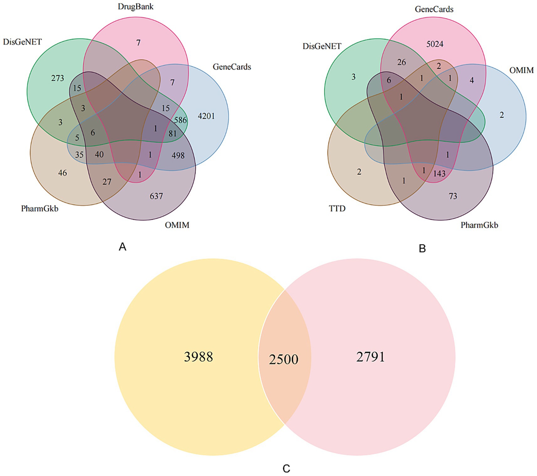 Figure 1. Venn diagrams of disease-related targets. This figure illustrates the process of identifying common targets. (A) Venn diagram showing the distribution of 6,488 unique PCOS-related targets collected from five databases: DrugBank, GeneCards, DisGeNET, PharmGkb, and OMIM. (B) Venn diagram showing the distribution of 5,291 unique infertility-related targets from five databases: GeneCards, OMIM, DisGeNET, TTD, and PharmGkb. (C) Venn diagram showing the 2,500 overlapping targets common to both PCOS and infertility, which formed the basis for subsequent analysis.
