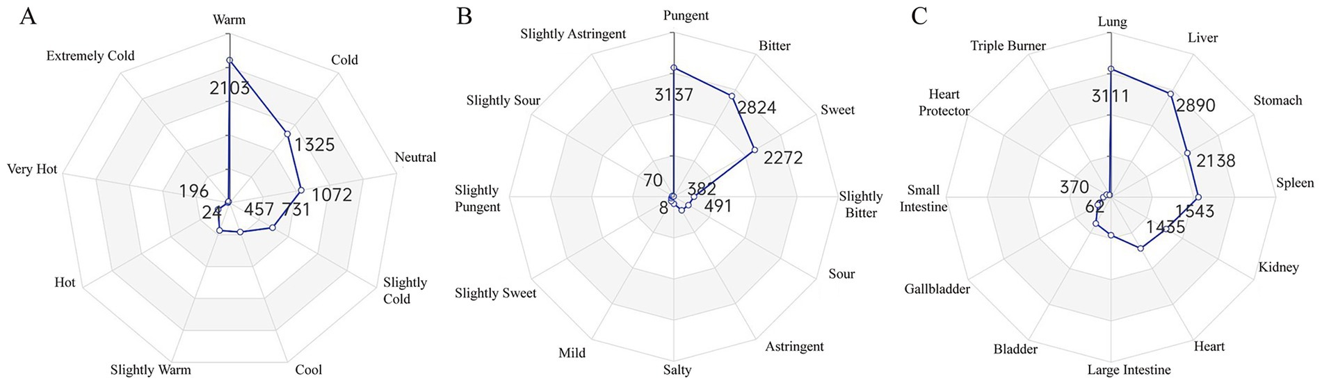 Figure 3. Analysis of herbal properties based on traditional chinese medicine theory. These radar charts quantify the TCM properties of the identified herbs. (A) Distribution of the Four Natures, showing a predominance of Warm and Cold properties. (B) Distribution of the Five Flavors, with Pungent, Bitter, and Sweet being the most common. (C) Distribution of Meridian Tropism, indicating that the herbs primarily act on the Lung, Liver, and Stomach meridians. The numbers on the axes represent the frequency of occurrence for each property.