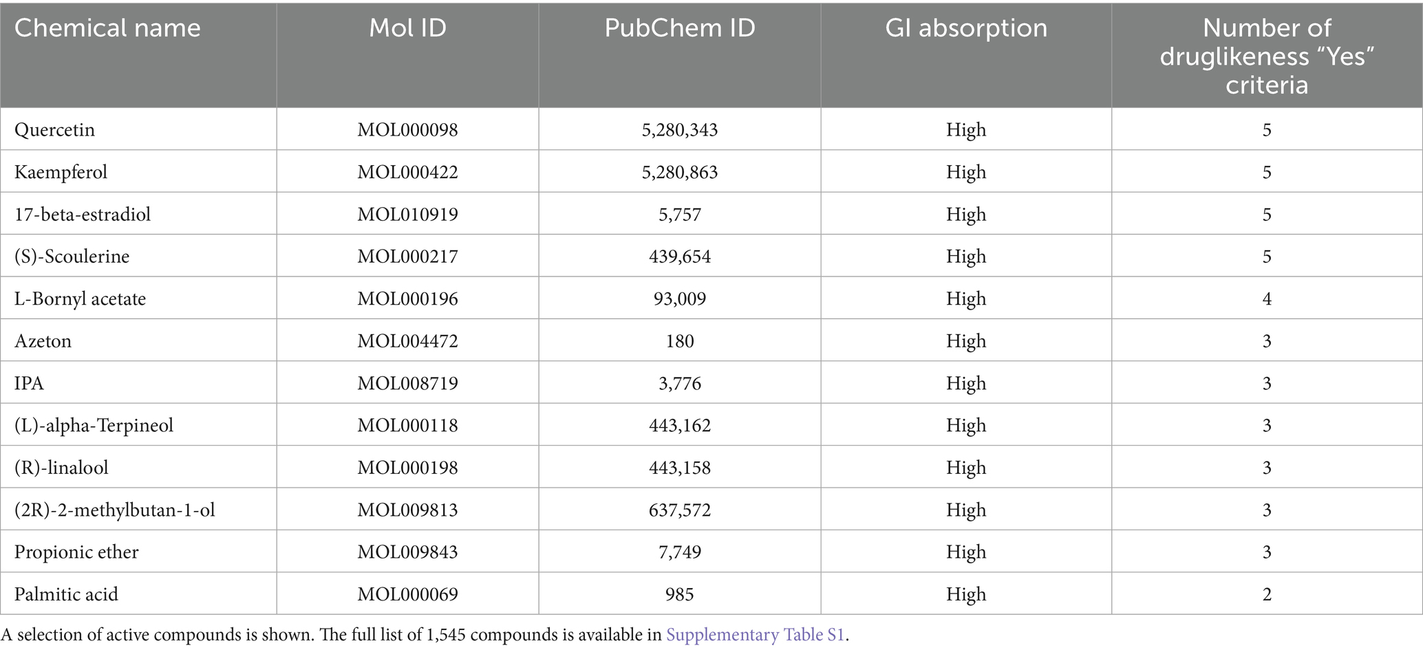 The 2,500 common targets were reverse-mapped through the TCMSP database, resulting in the identification of 25,540 associated compounds. These compounds were then subjected to pharmacokinetic screening using PubChem and SwissADME with the criteria of “GI absorption = High” and “Druglikeness ≥ 2 Yes.” This filtering process yielded 1,545 active compounds predicted to have therapeutic potential for PCOS-related infertility (Table 1).