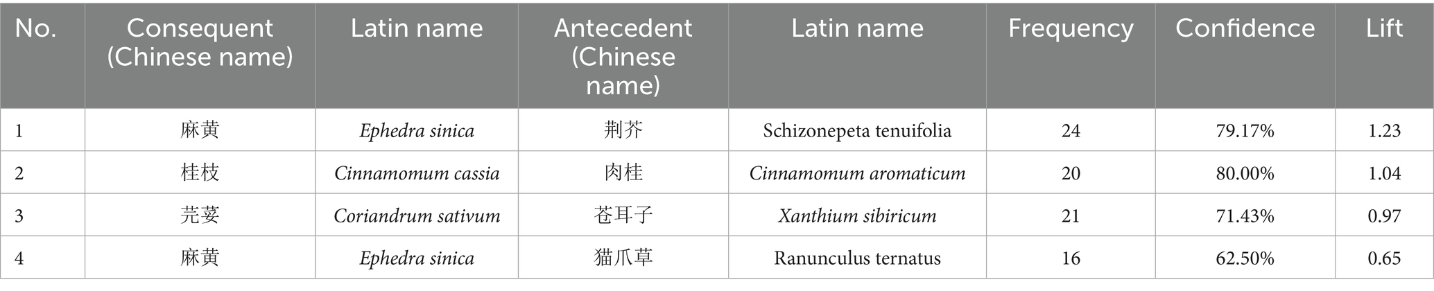 A complex network analysis of 247 herbs (frequency ≥10) was performed using IBM SPSS Modeler 18.0, with thresholds set at “strong link = 19, weak link = 10.” This analysis revealed key herbal associations. For instance, a strong association was found where the presence of Bupleurum chinense (Chaihu) and Ephedra sinica (Mahuang) predicted the co-occurrence of Chrysanthemum morifolium (Juhua) (26 occurrences). The detailed binary and ternary association rules are presented in Tables 3, 4, and a visualization of the network is shown in Figure 5.