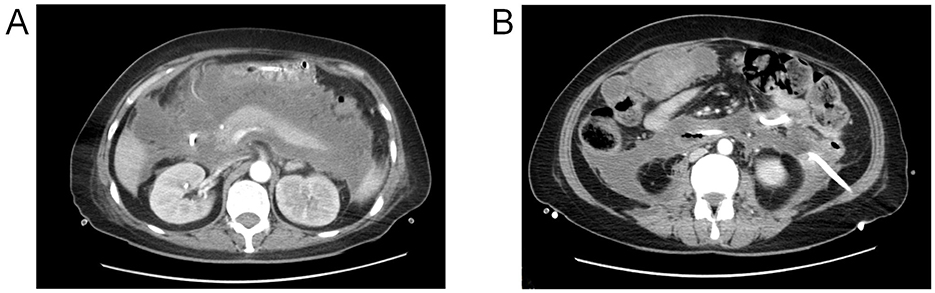 A 49-year-old female patient presented with epigastric pain and was diagnosed with severe acute pancreatitis (SAP) at an external hospital. Although early treatment improved her organ function, she developed fever at 4 weeks of disease progression. Computed tomography (CT) revealed extensive peripancreatic and retroperitoneal necrosis (infected pancreatic necrosis, IPN), classified as Balthazar grade III (Figure 1A) (9). Bilateral retroperitoneal catheter drainage (12Fr pigtail catheters) and aggressive anti-infective therapy led to significant fever reduction (Figure 1B). Unfortunately, at 6 weeks of disease progression, copious yellowish-brown digestive fluid was observed from the right abdominal drainage tube, strongly suggesting an upper gastrointestinal fistula. Concurrently, enteral nutrition was hindered by occlusion of the nasojejunal feeding tube. The patient was transferred to our hospital at 6 weeks of disease progression. Physical examination: Height 164 cm, weight 45 kg (BMI 16.7 kg/m2), temperature 36.7 °C, BP 128/63 mmHg, pulse 113 bpm, respiratory rate 22/min. Nutritional assessment via Nutrition Risk Screening 2002 (NRS-2002) scored 5 (malnutrition risk), with Global Leadership Initiative on Malnutrition (GLIM) criteria confirming severe malnutrition (10). Laboratory findings: albumin 30.2 g/L, prealbumin 0.129 g/L, CRP 215.8 mg/L, hemoglobin 78 g/L, potassium 3.12 mmol/L, phosphorus 0.49 mmol/L, sodium 135.5 mmol/L, and calcium 1.82 mmol/L.