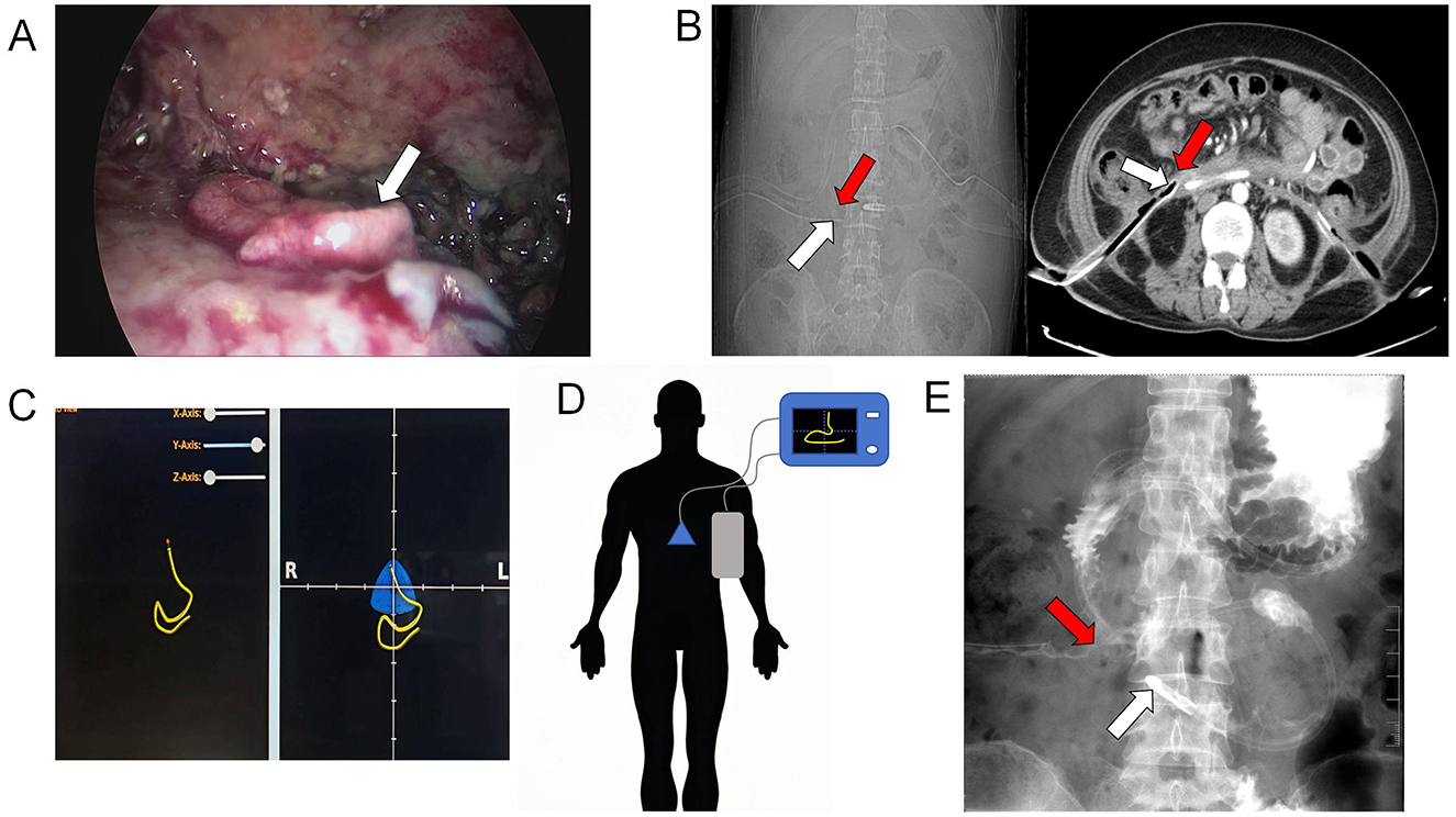 Figure 2. (A) Intraoperative visualization of the duodenal fistula orifice (white arrow); (B) Post-operative CT demonstrated the position of the drainage tube tip (white arrow) and the location of the duodenal fistula (red arrow); (C, D) use of electromagnetic navigation for inserting the nasojejunal tube; (E) the jejunal feeding tube tip position (white arrow) and duodenal fistula orifice localization (red arrow) was achieved via water-soluble iodinated contrast radiography.