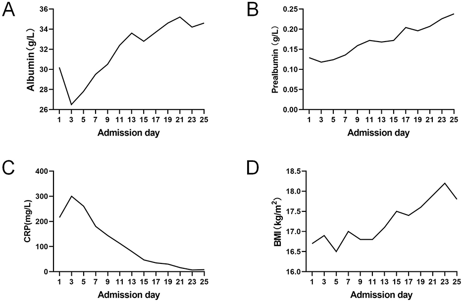 A protocolized nutritional regimen was implemented for this patient, aligned with the 2024 ESPEN (European Society for Clinical Nutrition and Metabolism) guidelines for acute pancreatitis (11). The therapeutic targets were set at protein 1.2–2.0 g/kg/day and calories 20–25 kcal/kg/day. No enteral formula reflux, abdominal distention, diarrhea, or refeeding syndrome occurred. Post-treatment laboratory trends demonstrated gradual improvement (Figure 3). The surgical drain was removed at 4 weeks post-procedure following confirmation of fistula closure. The patient successfully transitioned to oral alimentation with gradual EN weaning, maintaining >75% of target caloric intake via oral route by discharge.