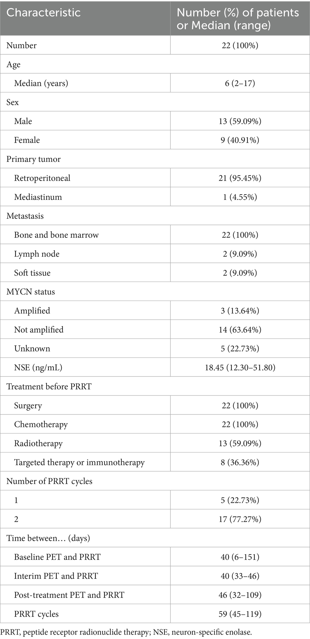 Twenty-seven children with neuroblastoma underwent baseline 18F-AlF-NOTATATE PET/CT between December 2022 and August 2023. Five patients were excluded due to insufficient tracer uptake at the tumor site on baseline 18F-AlF-NOTATATE PET/CT (n = 2) and withdrawal from the study (n = 3). Twenty-two patients, consisting of 13 boys and 9 girls, with a median age of 6 years (range: 2–17 years), met the eligibility criteria, received treatment, and underwent follow-up. Table 1 presents their clinical and tumor characteristics. The primary tumor site was the retroperitoneum in 95.45% of patients and the mediastinum in one patient. All of these primary tumors had been surgically resected prior to PRRT. All patients had residual bone and bone marrow lesions; only four patients had residual lymph node and soft tissue lesions (1 paravertebral nodule and 1 retroperitoneal nodule). Most patients underwent one of two cycles of PRRT: 5 underwent one cycle, and 17 underwent two cycles. The median administered dose was 3518.7 MBq (range: 1665–7,400 MBq).