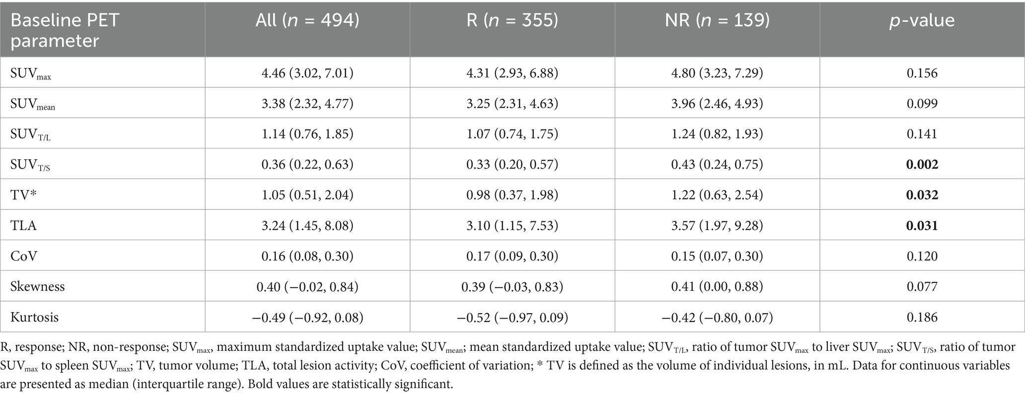 Baseline PET indices such as SUVmax, SUVmean, and SUVT/L did not significantly differ between the non-PD and PD groups, differing from previous NET studies (14). However, SUVT/S and TLA were significantly higher in PD lesions, though their predictive performance was low. The predictive accuracy of SUVT/S and TLA is limited due to intra-tumor and inter-individual heterogeneity, as well as the complex mechanisms of PRRT. In this study, we observed that the lesion TV in the PD group exceeded that in the non-PD group, which is in agreement with previous results (20, 28). The efficacy of 177Lu-DOTATATE is influenced by factors such as tumor size due to the limited penetration of the beta emission of 177Lu (approximately 0.23 mm) (40). Larger tumors, which often exhibit poor blood supply, are more resistant to radiation (41). Therefore, tumor size and other factors must be considered when planning PRRT for optimal outcomes.
