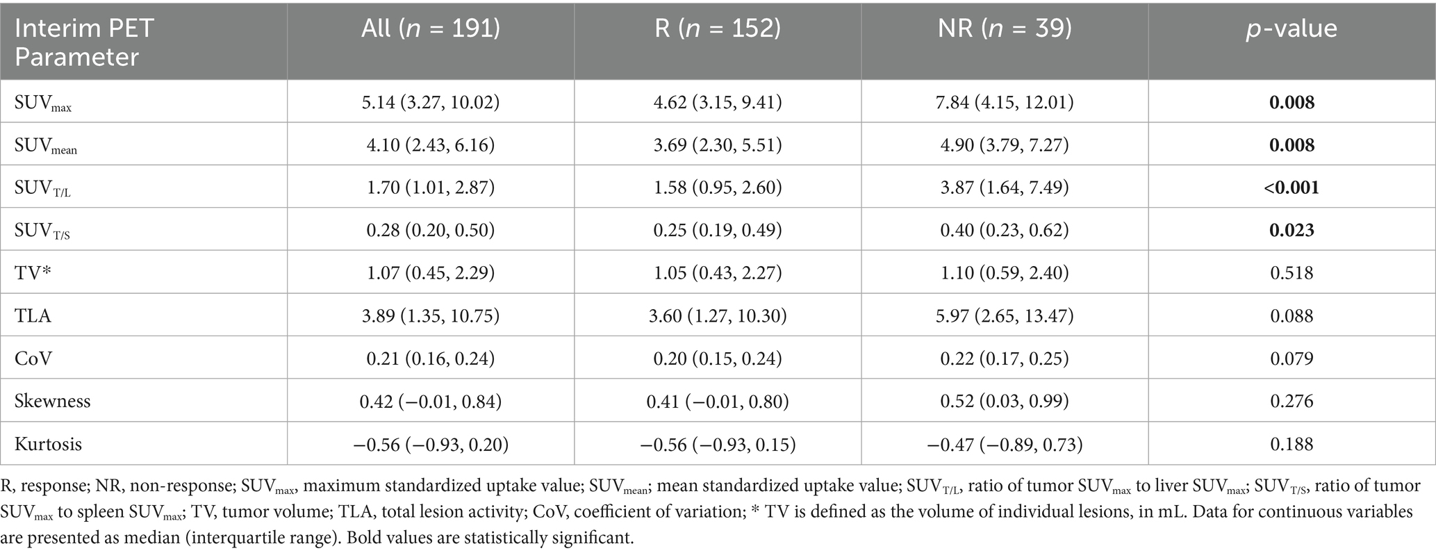 Table 3 shows the results of the lesion efficacy analysis, wherein 191 lesions were observed in the seven patients who underwent interim PET (152 lesions were identified in the non-PD group and 39 lesions in the PD group). The SUVmax (p = 0.008), SUVmean (p = 0.008), SUVT/L (p < 0.001), and SUVT/S (p = 0.023) values for non-PD lesions were significantly lower than those for PD lesions. However, the TV, TLA, and heterogeneity parameters did not differ significantly between the groups (p > 0.05).