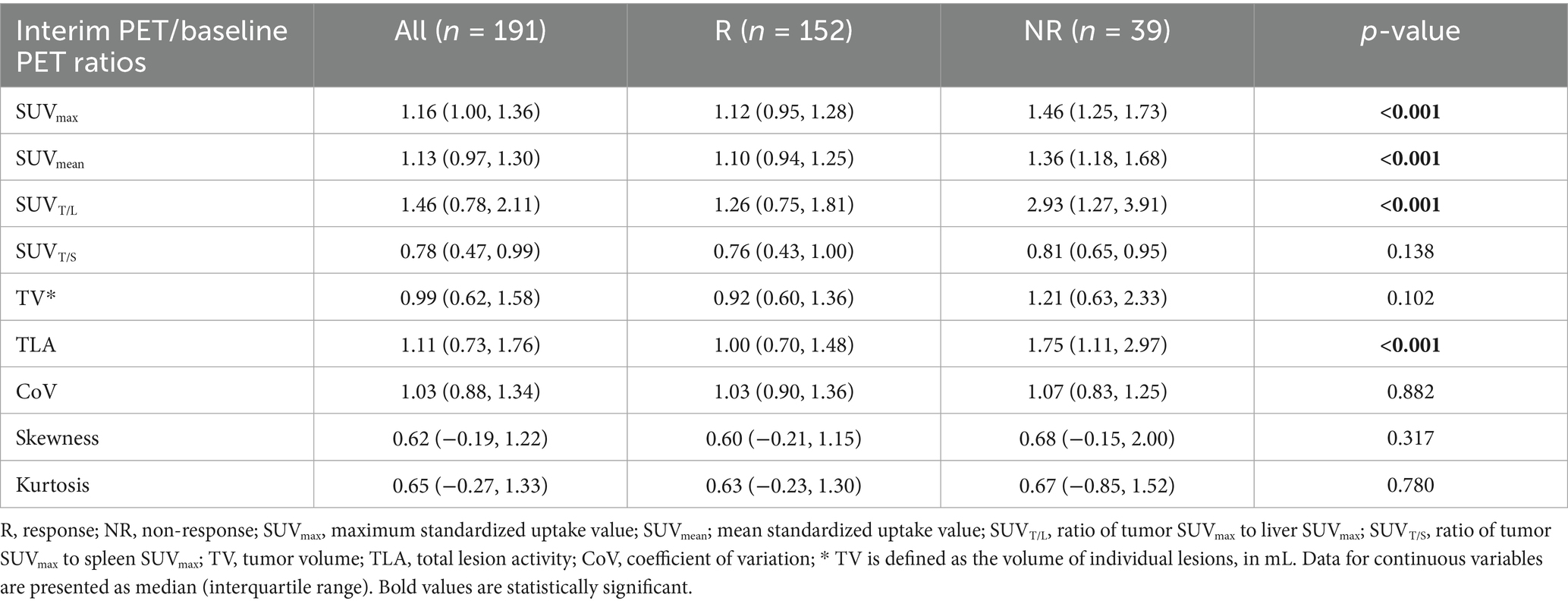 The ratios of interim-to-baseline SUVmax, SUVmean, SUVT/L, and TLA derived from PET in non-PD lesions were significantly lower than those in the PD lesions (all p < 0.001; Table 4). However, no significant differences were identified in the interim-to-baseline PET ratios for SUVT/S, TV, and heterogeneity parameters between the non-PD and PD groups (p > 0.05).