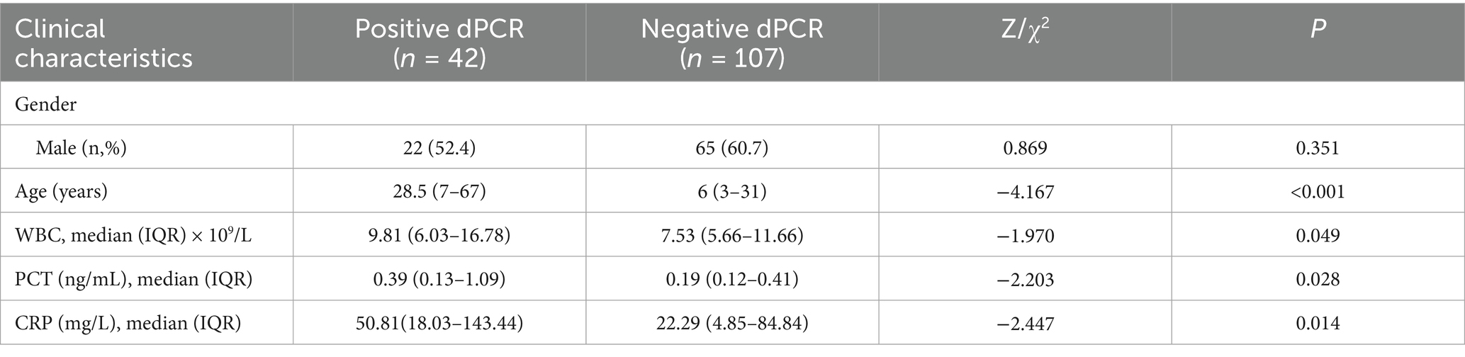 This study included 149 patients. They were divided into the following groups: positive dPCR group, which consisted of 42 patients [22 (52.4%) were men], with a median age of 28.5 (IQR, 7–67) years, and negative dPCR group, which consisted of 107 patients [65 (60.7%) were men], with a median age of 6 (IQR, 3–31) years. The age difference between the groups was statistically significant (p < 0.001, Table 1). For inflammatory factors, the median WBC count, CRP level, and PCT level in the dPCR-positive group were 9.81 × 109 (IQR, 6.03–16.78 × 109)/L, 50.81 (IQR, 18.03–143.44) mg/L, and 0.39 (IQR, 0.13–1.09) ng/mL, respectively. These values showed statistical significance in relation to the value in the negative dPCR group (p < 0.05, Table 1). The average detection time of dPCR was 4.8 ± 1.3 h, which was significantly shorter than the average time required for blood culture (94.7 ± 23.5 h) (Supplementary Table 1).