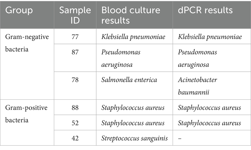 Table 2. Comparison between dPCR and blood culture for pathogen detection in patients with positive blood cultures.