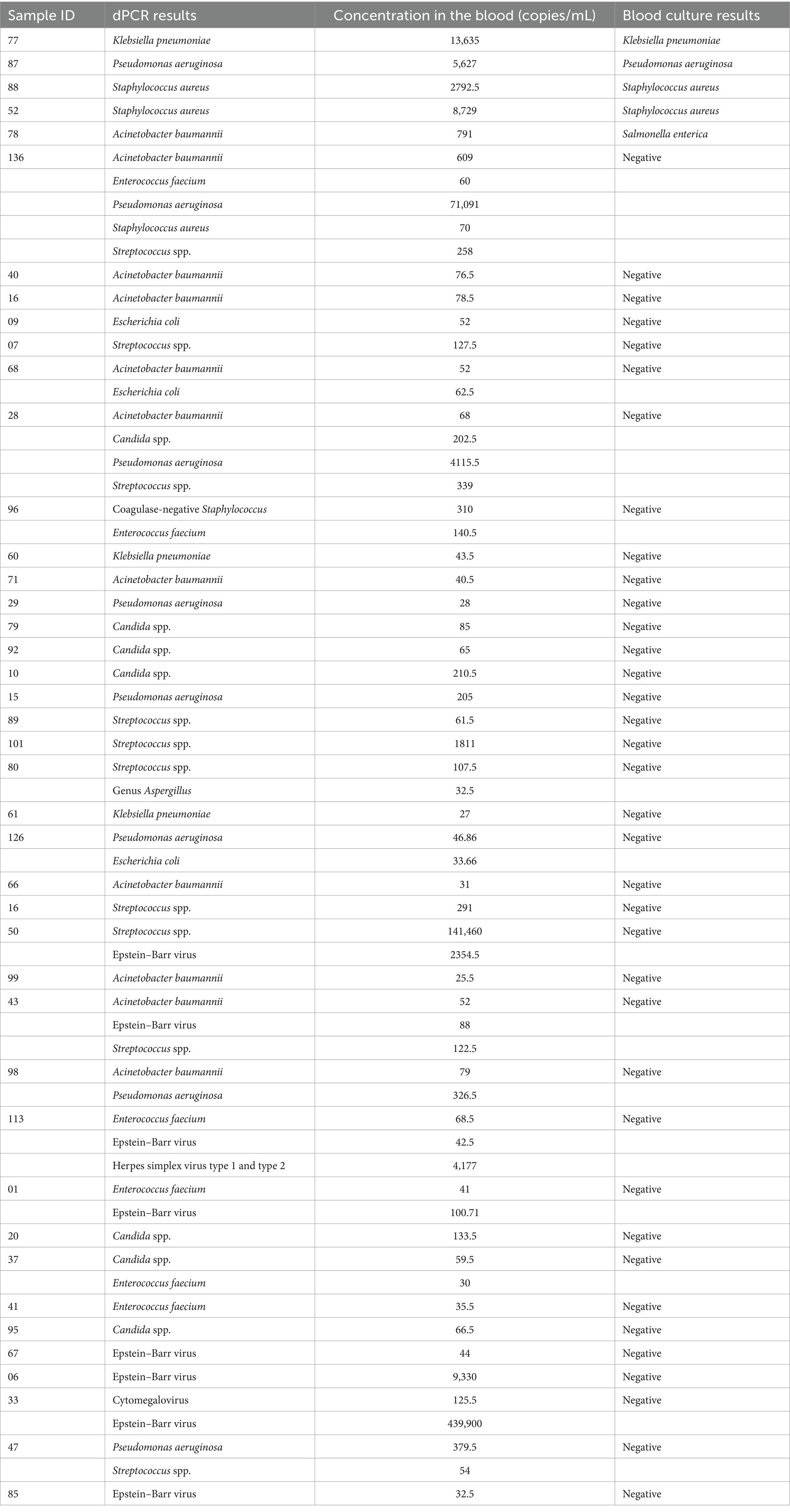 Results: Blood culture showed six positive specimens and six pathogenic strains, whereas dPCR assay showed 42 positive specimens and 63 pathogenic strains. The concentrations of positive pathogens detected via dPCR varied from 25.5 to 439,900 copies/mL.