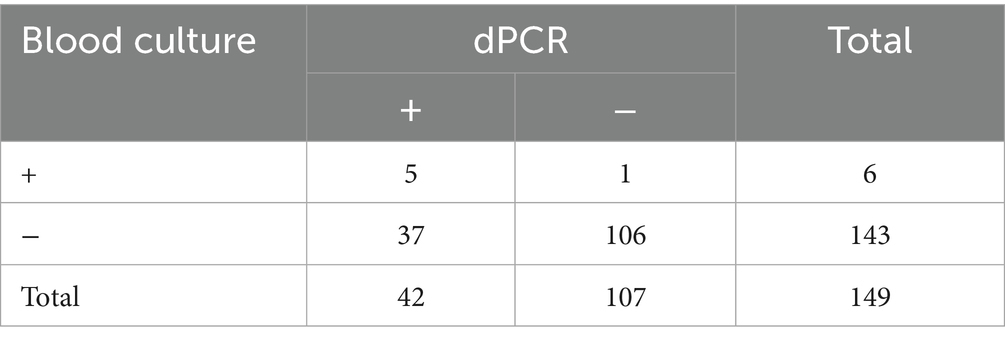 This study was approved by the Ethics Committee of the Army 73rd Group Military Hospital. A total of 149 cases were retrieved from the hospital information system between January 1, 2023, and December 31, 2024, for the patients concerned. The inclusion criteria were (1) fever at admission (≥38.0°C), (2) definite focus of infection, and (3) increased white blood cell (WBC) count (≥10.0 × 109/L), C-reactive protein (CRP) level (≥10 mg/L), and/or procalcitonin (PCT) level (≥0.05 ng/mL). This study retrospectively analyzed the testing records of venous blood samples maintained at our institution during 2023–2024. All samples were collected using standard aseptic procedures, and the historical records contained complete results of blood culture and dPCR.