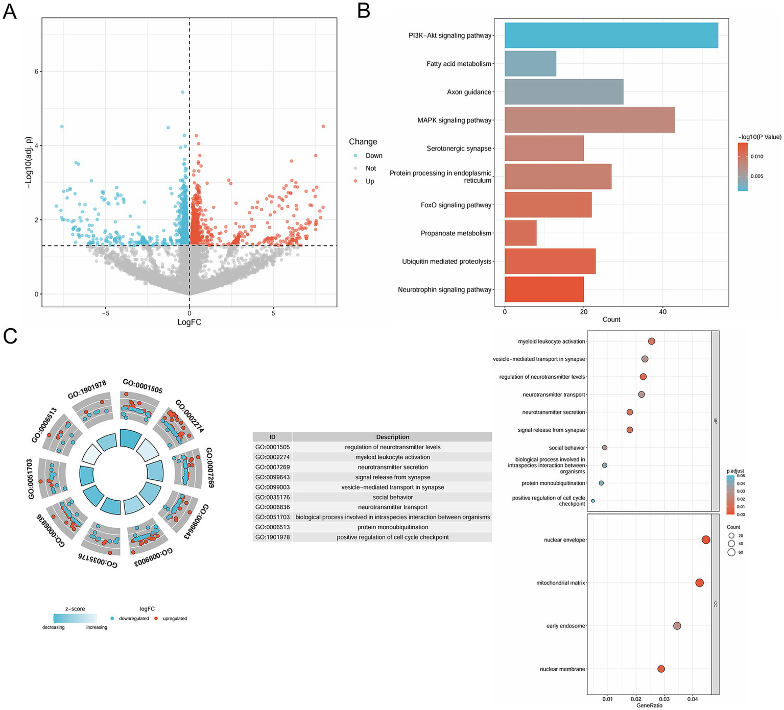 The research process for this study is illustrated in Figure 1. A total of 1,840 DEGs were identified, comprising 743 upregulated genes and 1,097 downregulated genes in pemphigus patients compared to the healthy control group. The volcano plot (Figure 2A) was utilized to visually depict the genes that exhibited significant differences in expression levels between the pemphigus and control groups. To facilitate understanding of the biological functions associated with the DEGs, KEGG and GO enrichment analyses were conducted. The KEGG enrichment analysis indicated that the DEGs were mainly associated with pathways such as the Pl3K-Akt signaling pathway, Fatty acid metabolism, Axon guidance, MAPK signaling pathway, Serotonergic synapse, Protein processing in endoplasmic reticulum, FoxO signaling pathway, Propanoate metabolism, Ubiquitin mediated proteolysis, and Neurotrophin signaling pathway (Figure 2B). Furthermore, results from the GO analysis revealed that these DEGs were linked to various biological processes, including myeloid leukocyte activation, vesicle-mediated transport in synapse, regulation of neurotransmitter levels, neurotransmitter transport, neurotransmitter secretion, signal release from synapse, nuclear envelope, mitochondrial matrix, early endosome, and nuclear membrane (Figure 2C).