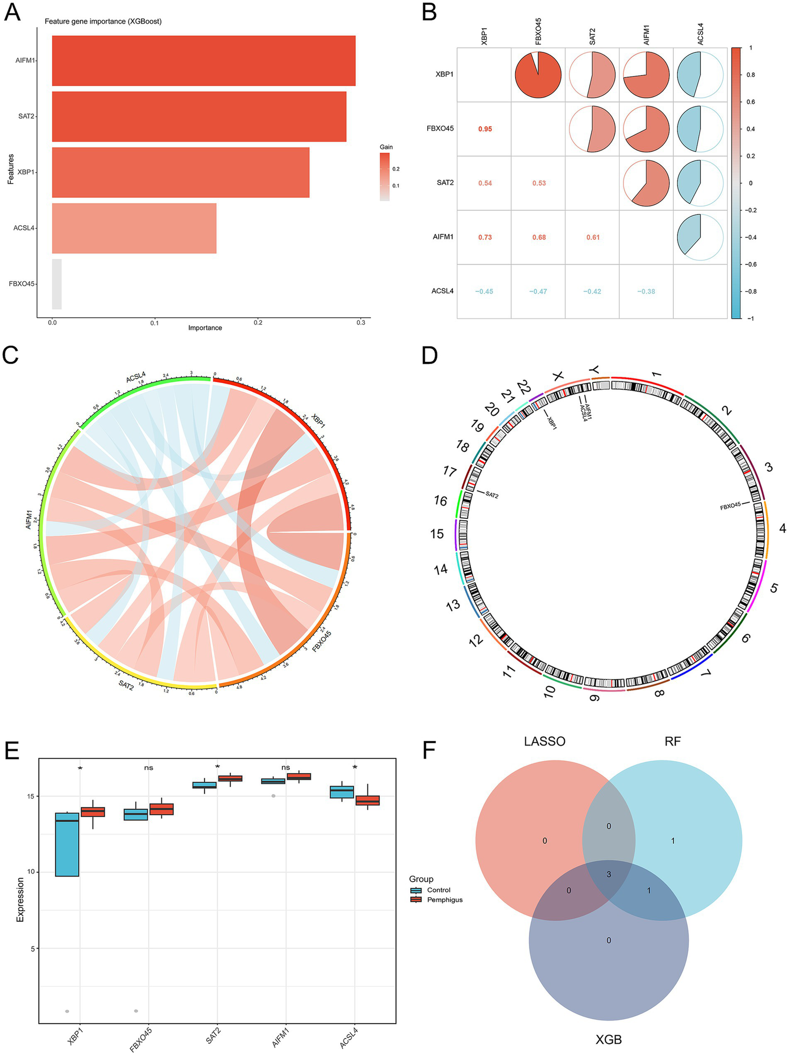 Identification of the 3 candidate hub genes. (A) The XGBoost algorithm was used to identify potential biomarkers. (B,C) The Spearman correlation analysis was conducted to assess the relationships among ferroptosis-related genes in pemphigus samples. (D) The positions of 5 key ferroptosis-related genes on the chromosome. (E) Expression analysis of the 5 key ferroptosis-related genes in the pemphigus and control groups. (F) A Venn diagram illustrates the overlapping hub genes identified by three distinct machine learning algorithms. *p < 0.05. XGBoost, eXtreme Gradient Boosting.