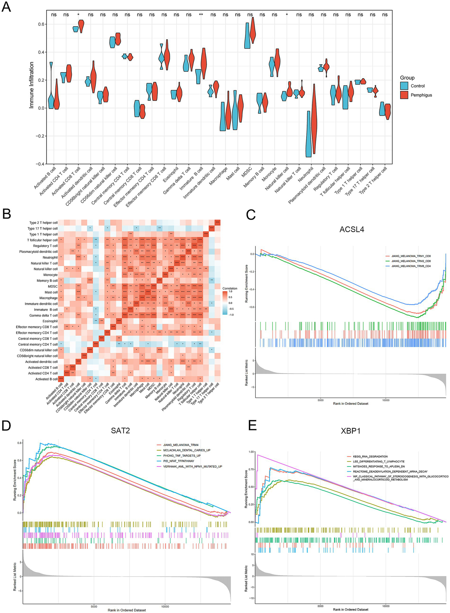 Immune infiltration and gene set enrichment analyses. (A) The violin plot illustrates the differences in immune cell types and infiltration between the pemphigus and control groups. (B) The heatmap displays the correlations among the proportions of infiltrating immune cell types. (C–E) Gene Set Enrichment Analysis of the hub genes. *p < 0.05, **p < 0.01, ***p < 0.001.