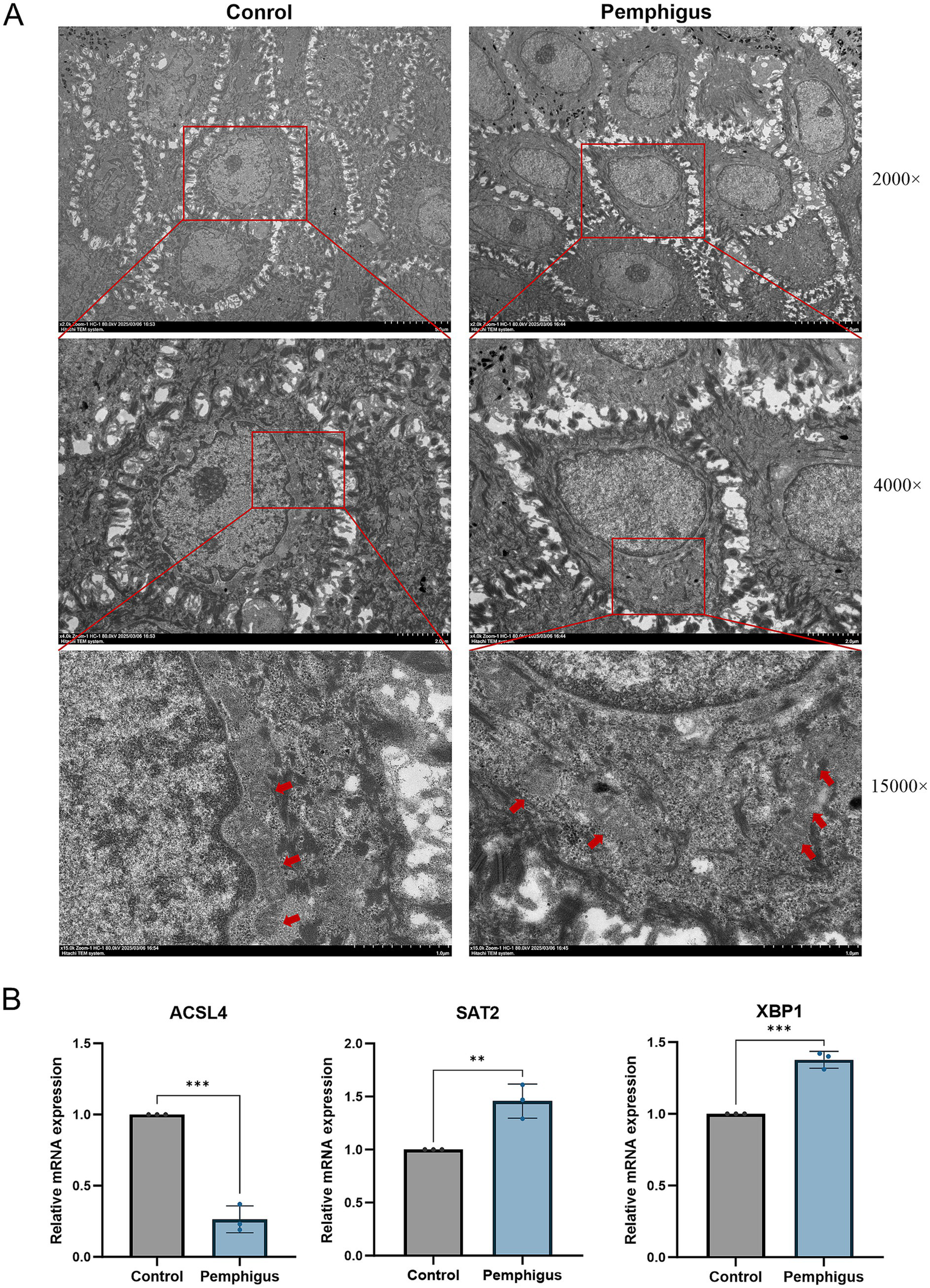 Validation by TEM and qRT-PCR experiments. (A) Samples were collected from the roof of bullae skin of pemphigus patients and normal skin adjacent to pigmented nevi for electron microscopy. Compared to the mitochondria in the control group, TEM reveals the presence of reduced mitochondria in keratinocytes, accompanied by a loss of cristae and disruption of the outer mitochondrial membrane. The red arrows indicate the mitochondria, while the values on the right represent different magnification levels. (B) qRT-PCR was performed to analyze the expression of hub genes ACSL4, SAT2, and XBP1 in both pemphigus and healthy skin tissues. Data were expressed as mean values with standard deviation (SD). Differences of results were analyzed using unpaired t test. TEM, Transmission electron microscopy; qRT-PCR, quantitative reverse transcription polymerase chain reaction. **p < 0.01, ***p < 0.001.