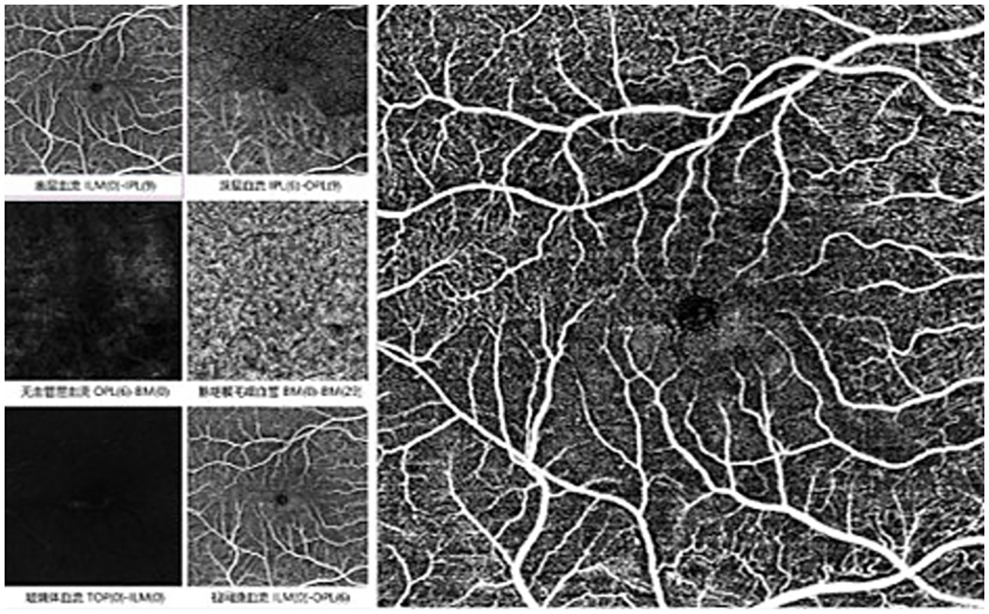 A 65-year-old Chinese man presented with a 5-day history of blurred vision and a black shadow in the upper visual field of the right eye, without associated ocular pain or redness. He had a 10-year history of hypertension but no history of diabetes. Two weeks prior, he had undergone phacoemulsification with intraocular lens implantation in the right eye. On initial examination, his uncorrected visual acuity was 0.6 (decimal) in both eyes, with best-corrected visual acuity (BCVA) of 1.0 in the right eye and no improvement in the left. Intraocular pressure was 10 mmHg in the right eye and 11 mmHg in the left. Fundus examination revealed cotton-wool spots in the posterior pole, macular edema, and retinal pallor in the inferior quadrant of the right eye (Figure 1a). Optical coherence tomography (OCT) of the macula showed increased inner retinal reflectivity and thickening with poorly defined retinal layers (Figure 1b). The left eye showed yellowish exudation nasal to the optic disc, vascular tortuosity, thinning, and arteriovenous crossing changes (Figure 1c). OCT of the left macula revealed no significant retinal edema (Figure 1d). OCT angiography (OCTA) of the right eye demonstrated non-perfusion in the superficial macular capillary plexus and disruption of the perifoveal vascular arcade (Figure 2).