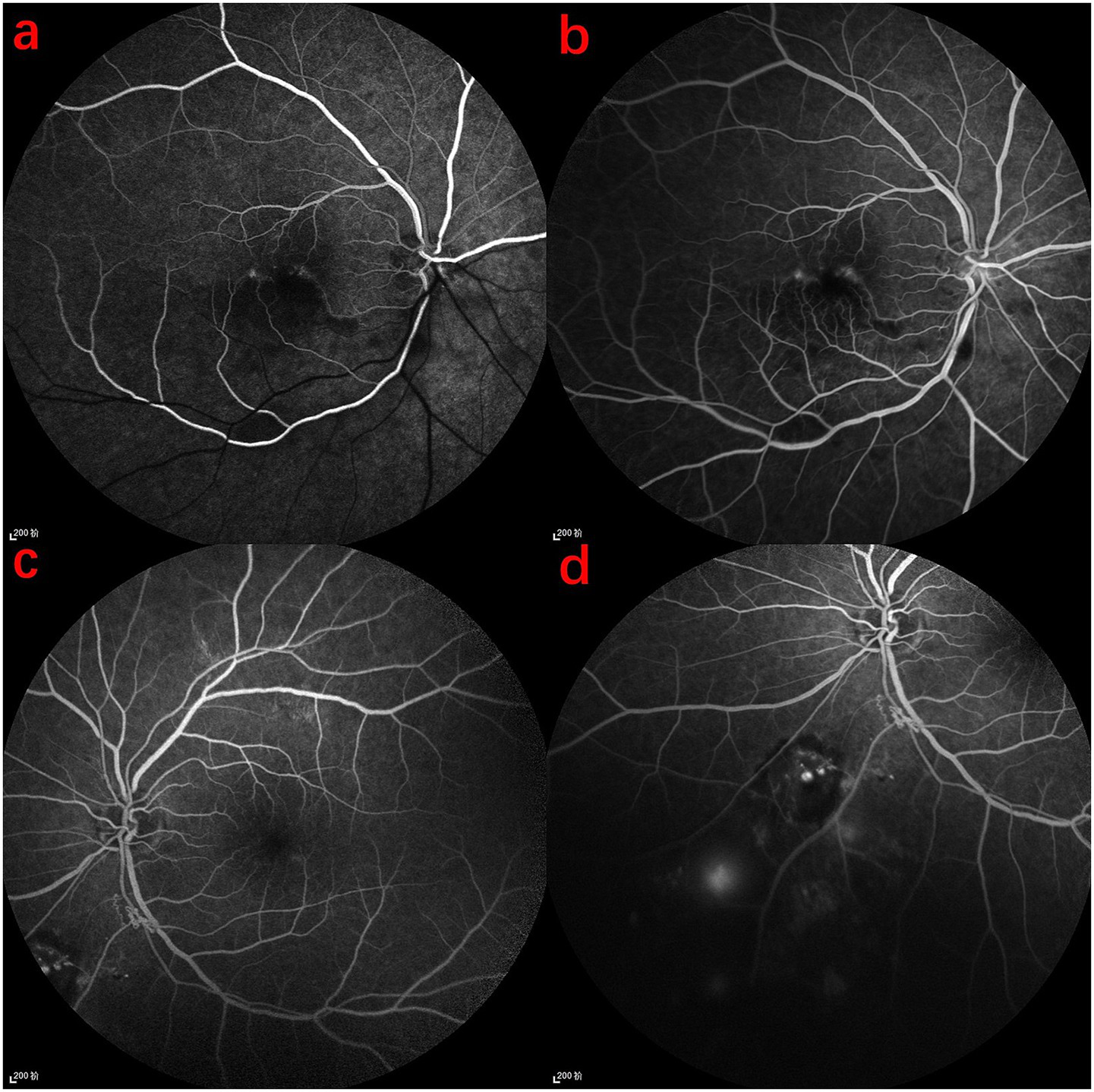 FFA findings in the patient. (a) Arterial phase of the right eye: normal arterial filling in the upper half, delayed filling in the lower half, with decreased fluorescence in the lower retinal background. (b) Late-phase macular area of the right eye: disruption of the retinal arcade and mild fluorescence accumulation. (c) Venous phase of the left eye: poorly defined refractive media, with localized subretinal hemorrhage inferior to the optic disc, showing patchy low fluorescence. (d) Evidence of microaneurysm leakage and neovascular leakage.