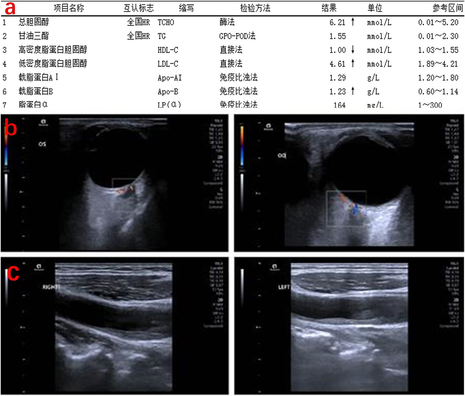 Lipid profile and vascular status of the patient. (a) Lipid profile: total cholesterol significantly elevated. (b) Posterior ocular vessel ultrasound: the right retinal central artery shows significantly reduced flow and velocity, with occlusion not ruled out. Reduced flow velocity in the right nasal ciliary posterior short artery. (c) Carotid ultrasound: bilateral carotid artery walls are irregular, with hypoechoic, hyperechoic, and mixed echogenic plaques visible in the common carotid artery, bifurcation, and the origin of the internal carotid artery. Blood flow filling defects are observed at the plaque sites.