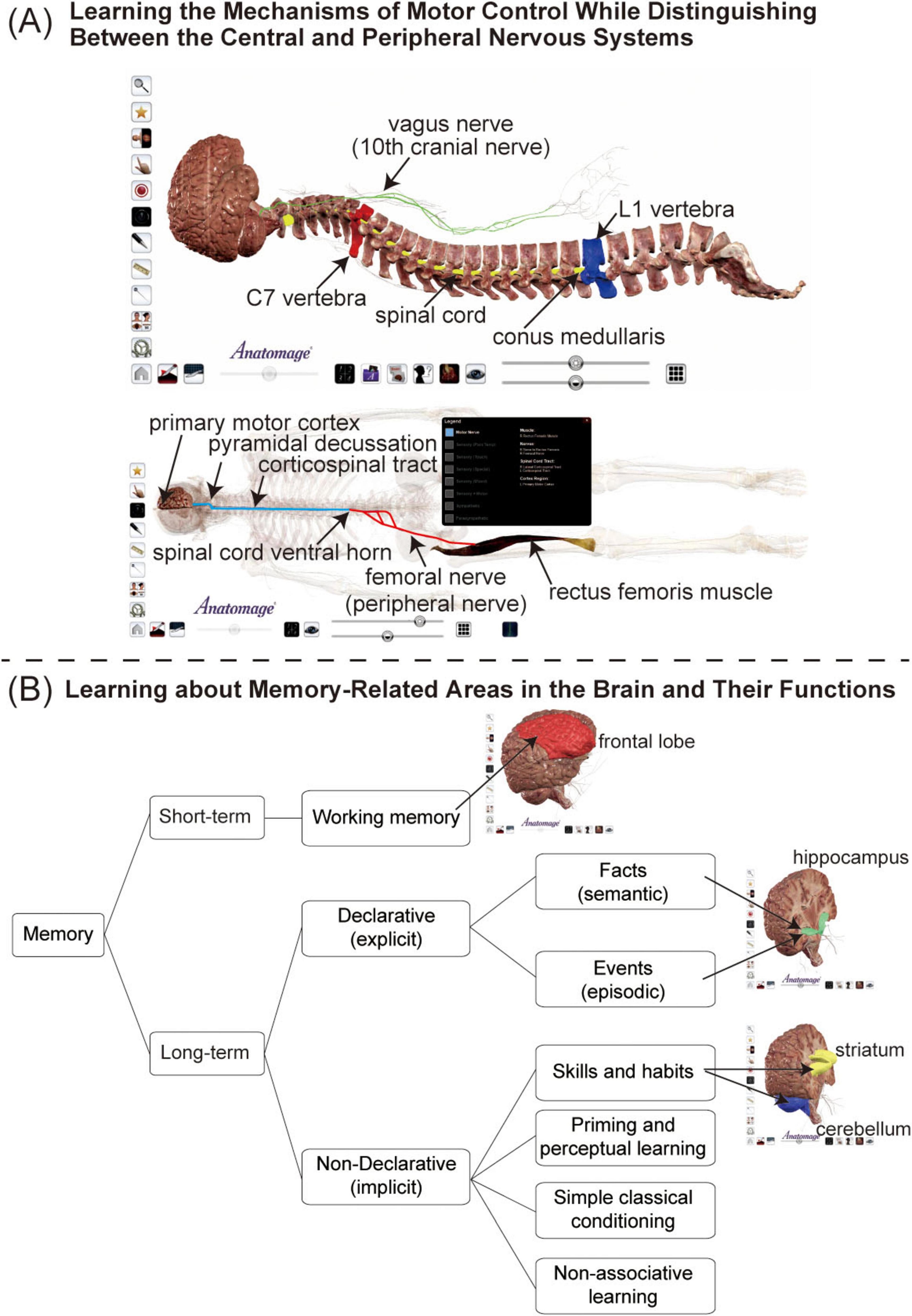 Figure 1. The report assignment. [(A): upper] Classification of the central and peripheral nervous systems. Students were asked to create a diagram similar to that shown in the figure. They were asked to show the brain and spinal cord as the central nervous system, and the vagus nerve (the 10th cranial nerve) as the peripheral nervous system. To make it easier for students to understand, the spinal cord was coded in yellow and the vagus nerve in green. In addition, the 7th cervical vertebra (C7) was shown in red and the 1st lumbar vertebra (L1) in blue, for easy understanding of the spine levels, length of the caudal side of the spinal cord, and location of the vagus nerve endings. [(A): lower] The content helped students to understand the corticospinal tract projection, which is a descending conduction pathway. Students were asked to visualize the projection starting from the primary motor cortex right up to the anterior horn of the spinal cord through the pyramidal decussation. In the figure, the corticospinal tract is in light blue, and after the synaptic connection at the anterior horn of the spinal cord, the projection from the peripheral nerves to the skeletal muscles continues to be seen. Additionally, the femoral nerve (peripheral nerve) innervating the right rectus femoris muscle is shown in red. (B) Areas responsible for human memory. Memory can be divided into short- and long-term. We focused only on working, declarative, and non-declarative memories, as these are associated with the skills and habits learned in the basic course. Students were asked to figure out their responsible regions anatomically.
