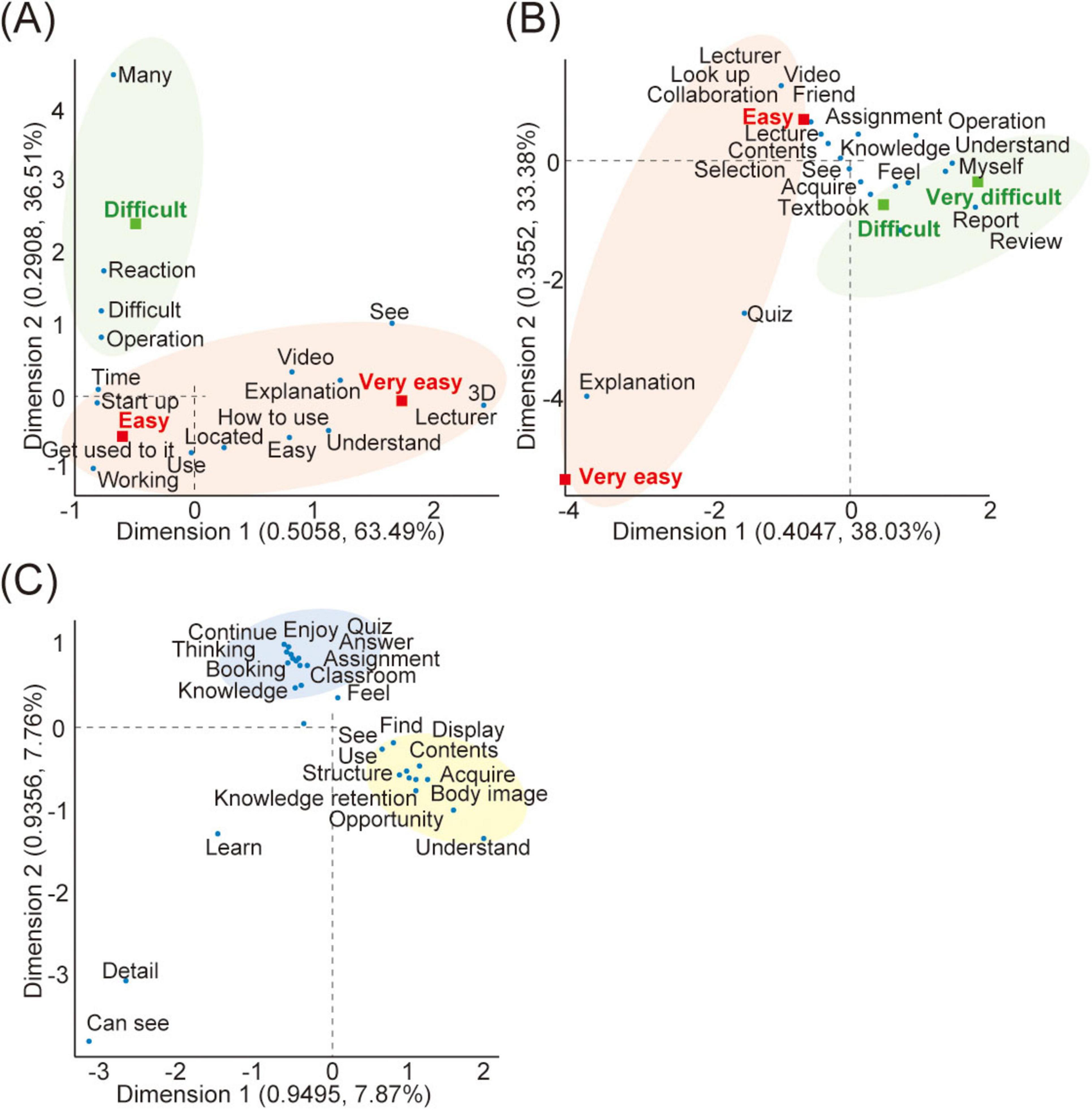 Figure 3. Results of the correspondence analysis of the students’ free-text responses using KH Coder. Correspondence analysis was conducted to visualize the characteristic word clusters from students’ comments for each question. Each plot shows that the farther the distance from the origin (0,0) along the x and y axes, the more distinguishable and distinctive the word clusters become. The area outlined in red indicates the words characteristic of “Very easy and Easy,” the area outlined in green indicates word groups related to “Difficult and Very difficult,” the area outlined in yellow indicates word groups related to knowledge and understanding gained through learning, and the area outlined in blue indicates word groups related to internal emotions and hardware aspects during the learning process. (A) For Question 1, terms such as “3D,” “Lecture,” “Explanation,” and “Video” were associated with “very easy/easy,” whereas “Many” and “Reaction” were linked to “difficult,” reflecting operational complexity. (B) For Question 2, “Collaboration” and “Friend” characterized “easy” responses, suggesting peer-supported learning, while terms related to insufficient knowledge appeared in “difficult” clusters. (C) For Question 4, clusters including “Body image,” “Structure,” “Knowledge retention,” and “Acquire” highlighted perceived educational benefits, whereas “Booking” indicated logistical challenges in using the Anatomage table.