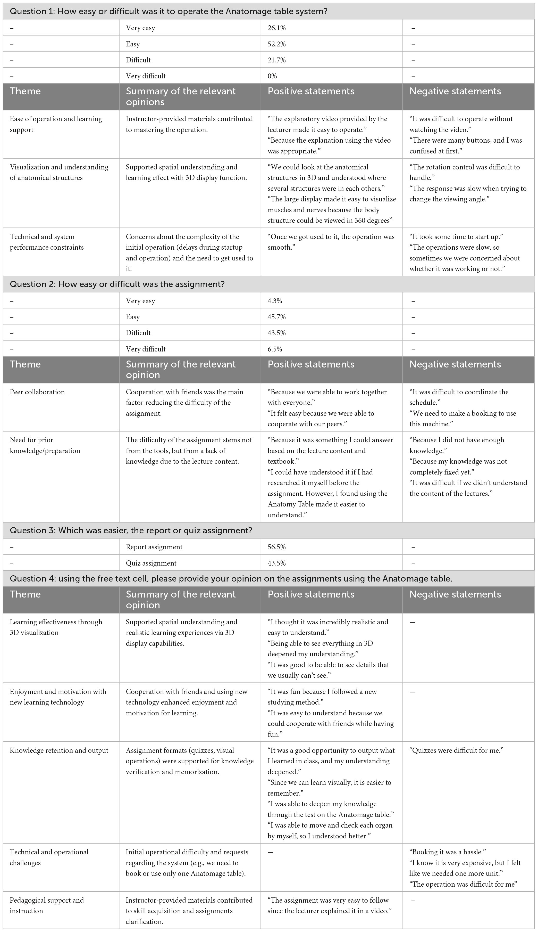 Responses were obtained from all 46 students who attended the neurophysiology lecture (Table 1). Most students’ responded “very easy or easy” to Question 1. However, approximately 20% found the system “difficult to use.” The free-text responses from students can be summarized as follows: (i) Operability and instructional support: Students reported that the table was easy to operate when clear instructional materials were provided during lectures; however, students experienced difficulties in operating the system when these materials were inadequate. (ii) Visual impact for learning human structures: The large display supported student understanding of anatomical structures, offering strong visual support in 3D; nonetheless, occasional technical malfunctions disrupted the learning process. (iii) Technical and system performance constraints: Once students became familiar with the system, its use was generally well-accepted. However, when the system performance was unstable or slow, it interfered with students’ learning processes. In response to Question 2, 50% of the students answered, “very easy or easy,” and the remaining, “difficult or very difficult.” The free-text responses expanded upon the themes identified in Question 1, namely, “operability” and “the value of 3D visualization in understanding human anatomy.” Two distinctive themes emerged: peer collaboration and students’ level of foundational knowledge acquisition. The responses indicated that students actively supported each other through peer learning while engaging in assignments, thereby promoting active learning. Conversely, students noted difficulties related to scheduling and reserving time to use a single Anatomage table collaboratively. Moreover, many students reflected that successful assignment completion required sufficient foundational knowledge. Those who had adequately reviewed and prepared in advance found the assignments relatively easy, whereas those with limited prior study perceived them as more difficult. The answers to Question 3 revealed that 56.5% of students preferred the report assignment, whereas 43.5% preferred the quiz. The free-text responses to Question 4, which provided overall reflections on the use of the Anatomage table, yielded four overarching themes: (i) the tool enables a three-dimensional understanding of human anatomy; (ii) it allows students to enjoy collaborative learning experiences with peers using a novel educational tool; (iii) it functions as an effective means for retaining, confirming, and outputting acquired knowledge, and (iv) it requires the effective implementation of careful instructional design and operational planning in educational settings.