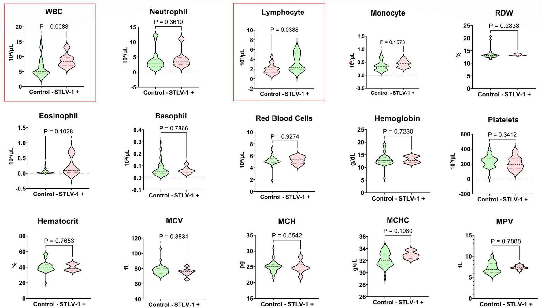 Comparative analysis of hematological parameters between C. aethiops STLV-1+ and healthy specimens. The comparison between non-parametric continuous variables was performed using the Mann-Whitney test.