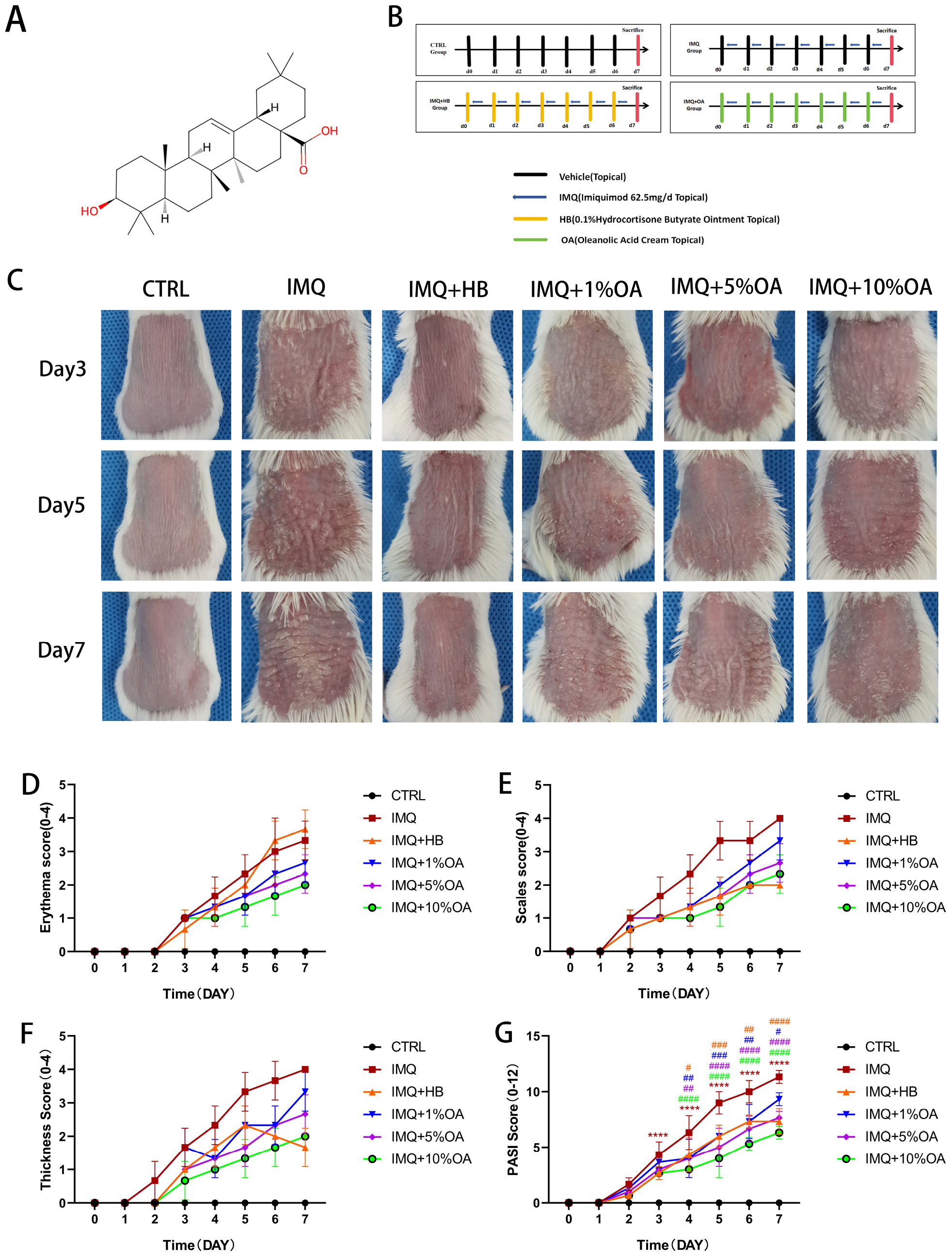 Figure 1. Oleanolic acid attenuates IMQ-induced psoriasis-like skin lesions in mice. (A) Chemical structure of oleanolic acid, Pubchem CID: 10494; (B) experimental design for the psoriasis-like animal model and oleanolic acid administration protocol; (C) clinical manifestations of mice in each group on days 3, 5, and 7; (D) severity scores for erythema in the affected skin areas of mice (0-4); (E) severity scores for scaling in the affected skin areas of mice (0-4); (F) severity scores for infiltration in the affected skin areas of mice (0-4) (0-4); (G) PASI scores for the affected skin areas of mice (0-14) (0-4); ****P < 0.0001 vs. control group; #P < 0.05, ##P < 0.01, ###P < 0.001, ####P < 0.0001 vs. IMQ group.