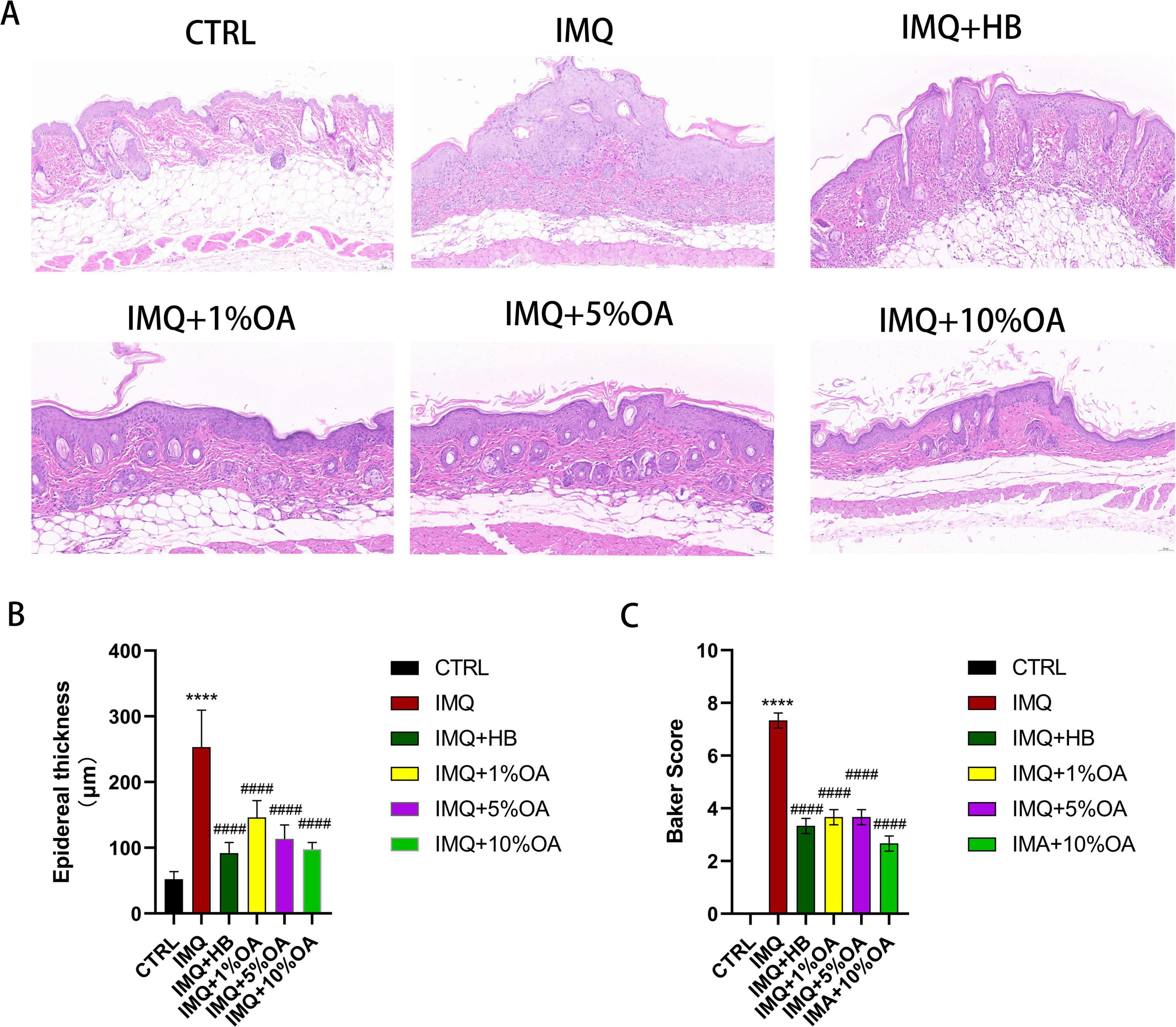Figure 2. Effects of OA administration on skin pathology in psoriasis-like mice. (A) H&E staining of skin tissues from each group (20.0× magnification); (B) epidermal thickness measured using ImageJ software; (C) baker scores for skin tissue pathology in each group; ****P < 0.0001 vs. control group; ####P < 0.0001 vs. IMQ group.