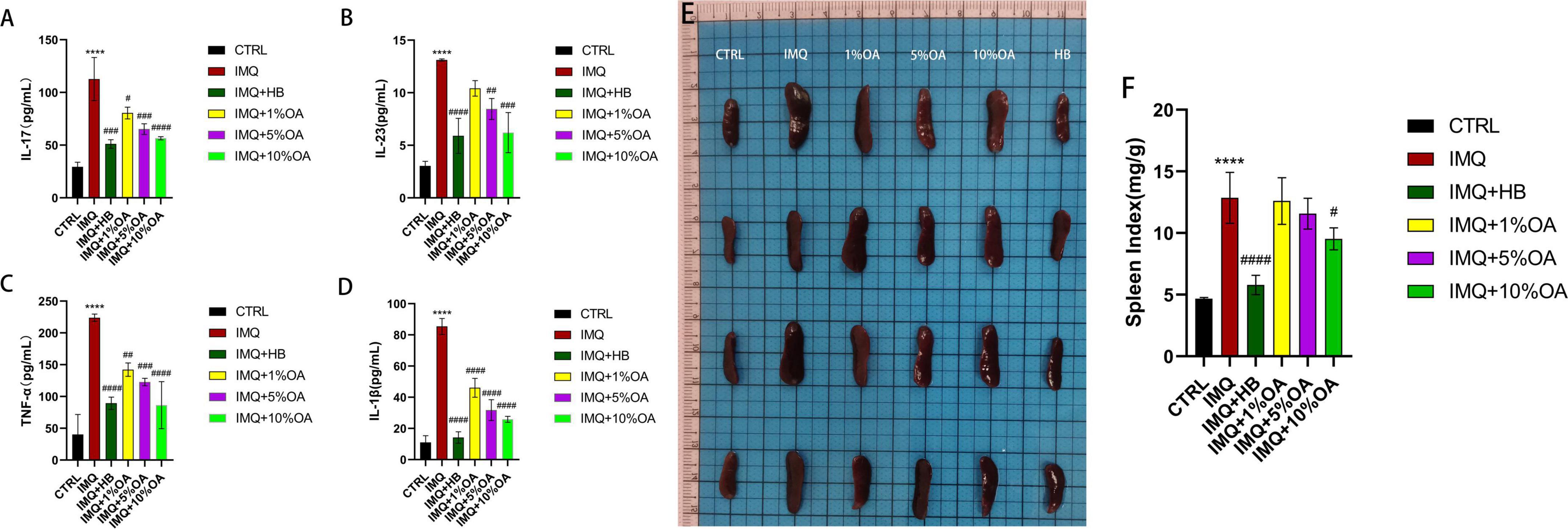 Figure 3. Effects of OA on systemic inflammatory responses in psoriasis-like mice. (A–D) Levels of IL-17, IL-23, TNF-α and IL-1β in mouse peripheral blood analyzed by enzyme-linked immunosorbent assay (ELISA); (E) representative images of spleens from mice in each group; (F) spleen index for mice in each group; ****P < 0.0001 vs. control group; #P < 0.05, ##P < 0.01, ###P < 0.001, ####P < 0.0001 vs. IMQ group.