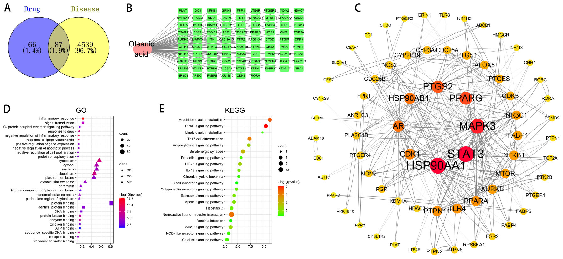 Figure 4. Network pharmacology predicts the mechanism of action of OA in treating psoriasis. (A) Potential targets for oleanolic acid (OA) in the treatment of psoriasis; (B) component-target-disease network (rectangles represent targets, ellipses represent drug components); (C) target network for OA’s treatment of psoriasis; (D) GO annotation of drug-disease targets (top 10 GO functional categories selected, P < 0.05); (E) KEGG pathways of drug-disease targets (the size of the circle represents the number of genes enriched on the corresponding pathway, from green to red indicating a gradually decreasing P-value. Based on the P-value, the top 20 KEGG metabolic pathways are screened and bubble charts are drawn, with the horizontal axis representing the number of genes enriched on the pathway. The size of the bubbles represents the number of genes enriched on the corresponding pathway, and the depth of color represents significance, allowing for intuitive observation of significantly enriched information).