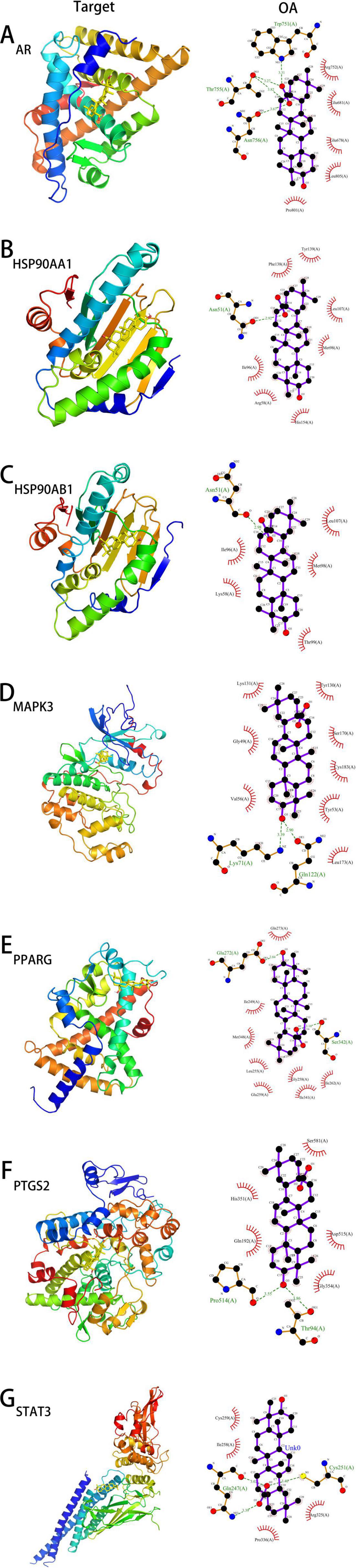 Figure 5. The docking models of OA with core targets. (A–G) represent the docking models of OA with AR, HSP90AA1, HSP90AB1, MAPK3, PPARG, PTGS2, and STAT3, respectively.