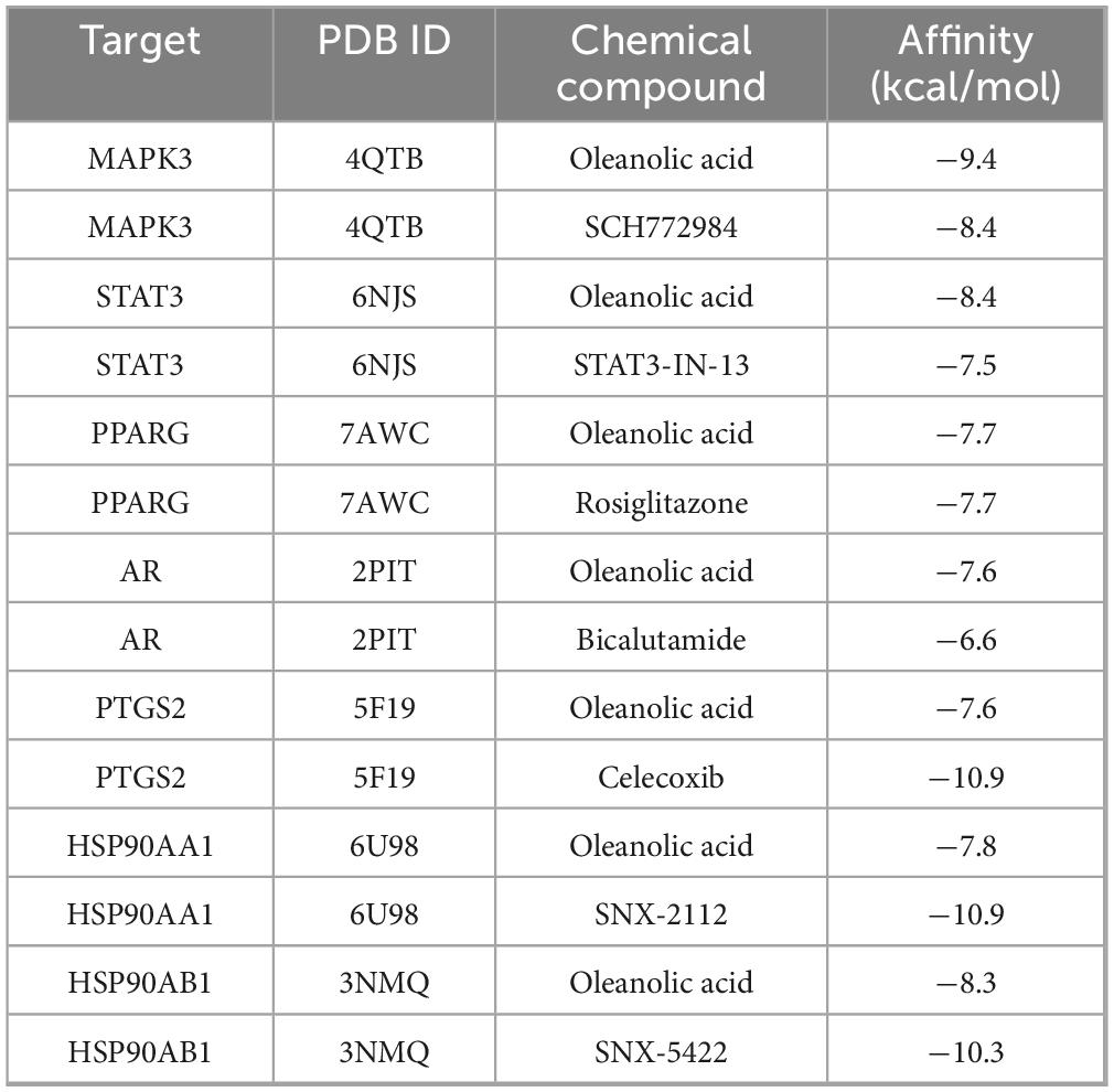 To evaluate the molecular binding affinity between oleanolic acid (OA) and target proteins, we compared the binding affinity of each target protein with its known ligand (positive control) as a reference, as detailed in Table 1. The binding affinity of MAPK3, STAT3, and AR to OA was significantly stronger than that to their known ligands, suggesting that OA may serve as a potential agonist/inhibitor for these targets. For PPARG, the binding affinity of OA was comparable to that of rosiglitazone, indicating its potential as a PPARG modulator. Although the binding affinities of PTGS2, HSP90AA1, and HSP90AB1 to OA were weaker than those to their respective known ligands, they still fell within the range of strong binding activity (affinity ≤ −7.6 kcal/mol), implying potential binding specificity that requires further validation. Molecular docking predictions indicate that OA exhibits binding affinities to MAPK3, STAT3, AR, and PPARγ that are comparable to or even stronger than those of known ligands. However, these computational results necessitate further verification through in vitro and in vivo experiments.
