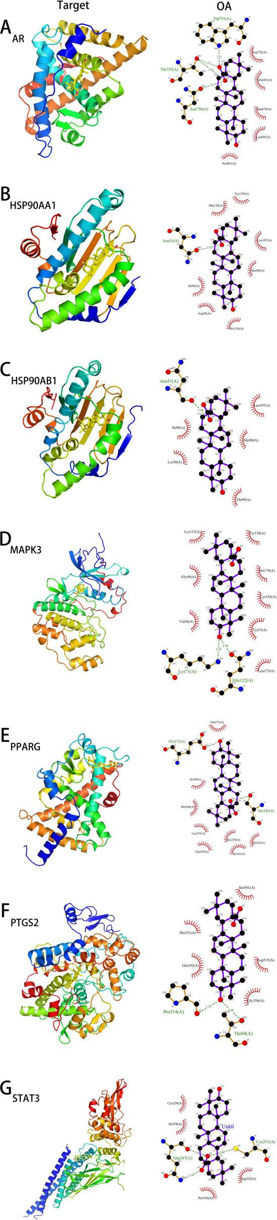 The docking models of OA with core targets. (A–G) represent the docking models of OA with AR, HSP90AA1, HSP90AB1, MAPK3, PPARG, PTGS2, and STAT3, respectively.