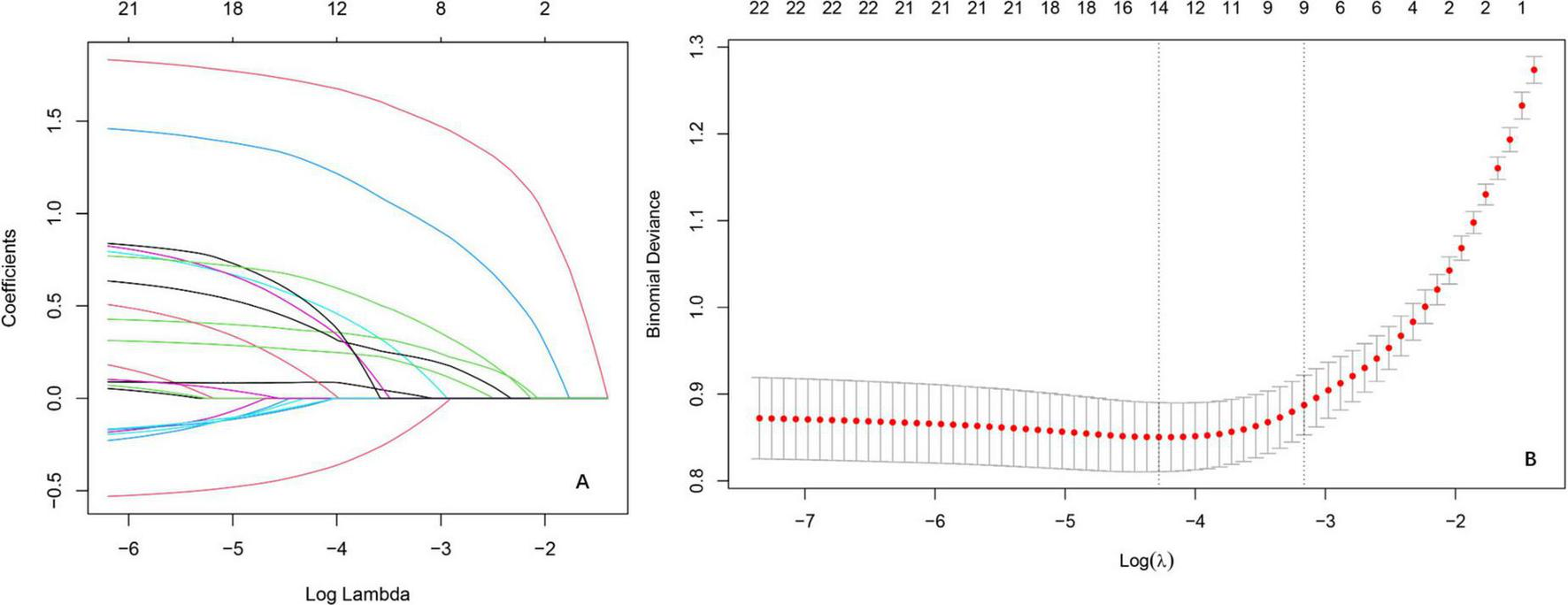 Variable selection by the LASSO regression model. (A) Lasso coefficient paths illustrating the shrinkage of regression coefficients as the penalty parameter [log(λ)] increases. The vertical axis represents coefficient magnitudes, with coefficients shrinking toward zero as λ increases, reflecting the sparsity-inducing property of Lasso. (B) Cross-validation results evaluating model performance across different λ values.